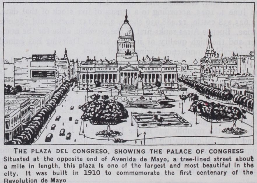 BUENOS AIRES, the capital, and chief port of the Repub lic of Argentina, is situated in a Federal district of 72 sq.m. which lies along the western shore of the Plata river estuary. The city is about 125m. from the Atlantic ocean in 36' 21" S. and 21' 33" W. It is only about 65ft. above sea-level. The population in 1934 was about 2,230,946. The city is laid out on the "checkerboard" plan with streets intersecting at right angles. Of the business streets Avenida de Mayo stands first; it is 12oft. wide, extending from Plaza Mayo to the Palacio del Congresso, for about a mile. Its striking features are the uniformity of height (generally six to eight stories) and fine architecture of the build ings. It has a double row of lights along the middle, and is lined with trees. The city's architecture, largely of the French Renais sance, has been promoted by the municipality's annual award of prizes for the most attractively designed business and residence building. The city has more than a hundred parks covering a total area of 3,00o acres. The largest is Parque 3 de Febrero, at the suburb of Palermo, one of the most popular resorts, reached by splendid boulevards. The principal square of the city is the Plaza de Mayo, on to which front the Government palace, the Banco de la Nacion and the historic cathedral in which repose the remains of the Argentine hero, Gen. San Martin. Other notable buildings are the Colon theatre, the Palace of Justice, the Capitol, the opera house, the Jockey club, etc.