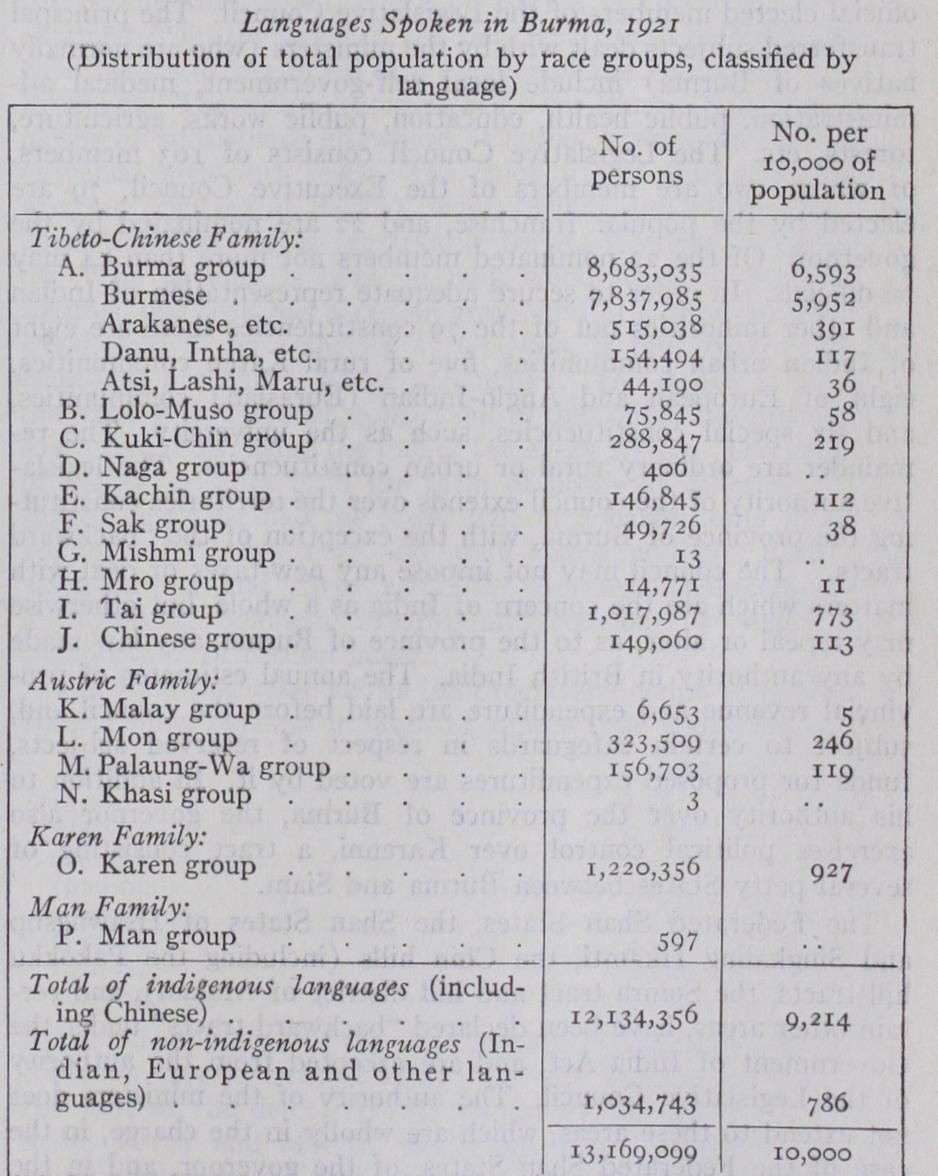 Note: There is an increasing tendency for Burmese to become the language of people belonging racially to such groups as Kuki-Chin, Kachin and Tai.