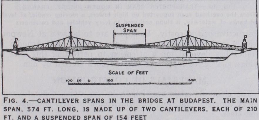 type is often adopted when large spans have to be constructed, the limiting size being as high as about 3,000 feet. The principle is that of two projecting arms reaching towards each other, the gap between their ends being bridged by means of an independent, or suspended, span. The weight of all these is balanced by projecting arms reaching shorewards and anchored down. The stresses are quite determinate but, as in all large structures, the calculations are laborious and many secondary stresses have to be investigated. The effect of wind on large structures of this type is very serious and, in the Forth bridge, with spans of i,7ioft., the amount of steel provided to resist the stresses set up by this agency amounts to 47% of the total weight of the cantilevers. Fig. 4 shows the cantilever bridge at Budapest with a main span of 5 74f t. made up of two cantilevers of 2 r of t. and a suspended span of '54 feet.