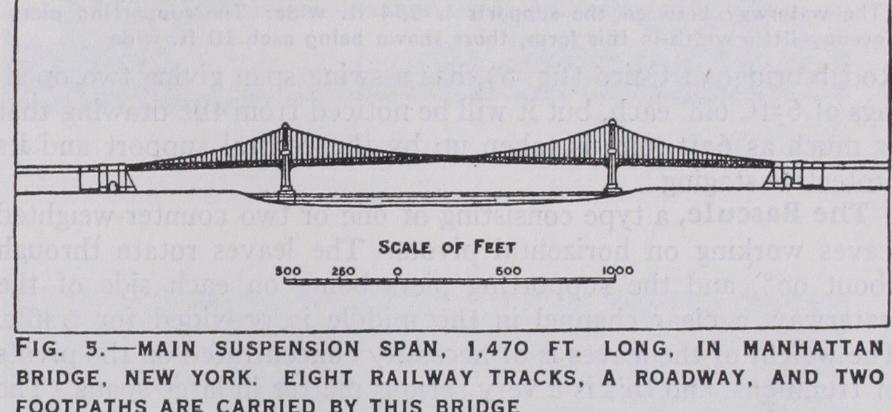 a type which lends itself readily to the con struction of the largest spans, the theoretical limit being in the neighbourhood of 7,000 feet. Camden bridge over the Delaware river has been constructed with a span of 1,75oft., and a bridge of double this span has been commenced over the Hudson river at New York. A suspension bridge consists of steel wire ropes or steel links of high tensile strength passing over lofty towers and anchored at each end. The platform for the roadway is suspended from the main ropes or chains by means of vertical ropes, and the change of form and swaying set up by moving loads is largely reduced by means of horizontal stiffening girders placed at road level. This type is not usually adopted for railway bridges on account of the changes of form that take place in spite of the stiffening girders. However, in large spans the inertia of the dead weight of the bridge is so great that this difficulty has been largely overcome, and both the completed large suspension bridges re ferred to above, together with others of older date, have railway tracks on them. Manhattan bridge, New York (fig. 5), constructed 1903-9, carries eight railway tracks, together with a roadway 3 5f t. wide and two footpaths.