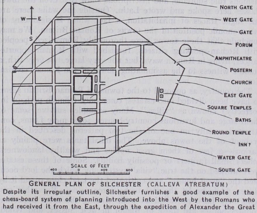 The streets vary in width. The intersect regularly at right angles, dividing the town into square blocks, like modern Mann heim or Turin, according to a Roman system usual in both Italy and the provinces, and derived ultimately from Babylon and :.he East through Alexander the Great and his successors. The walls are often later than the streets, having been erected when the peace of the province began to be seriously threatened by barbarian inroads. The inference suggested by the appearance of the chess board system of town-planning is confirmed by the testimony of the numberless small objects recovered in the course of the ex cavations—coins, pottery, window and bottle and cup glass, bronze ornaments, iron tools, etc. Few of these are individually notable. Traces of late Celtic art are singularly absent ; Roman fashions rule supreme, and inscriptions show that even the lower classes here spoke and wrote Latin. Outside the walls there are but slight traces of inhabitation, a fact which is significant of the economic position of the towns of Roman Britain. We may conclude that these towns were thoroughly Romanized, peopled with Roman-speaking citizens, furnished with Roman appurte nances, living in Roman ways, but not very large, not very rich, a humble witness to the assimilating power of the Roman civiliza tion.