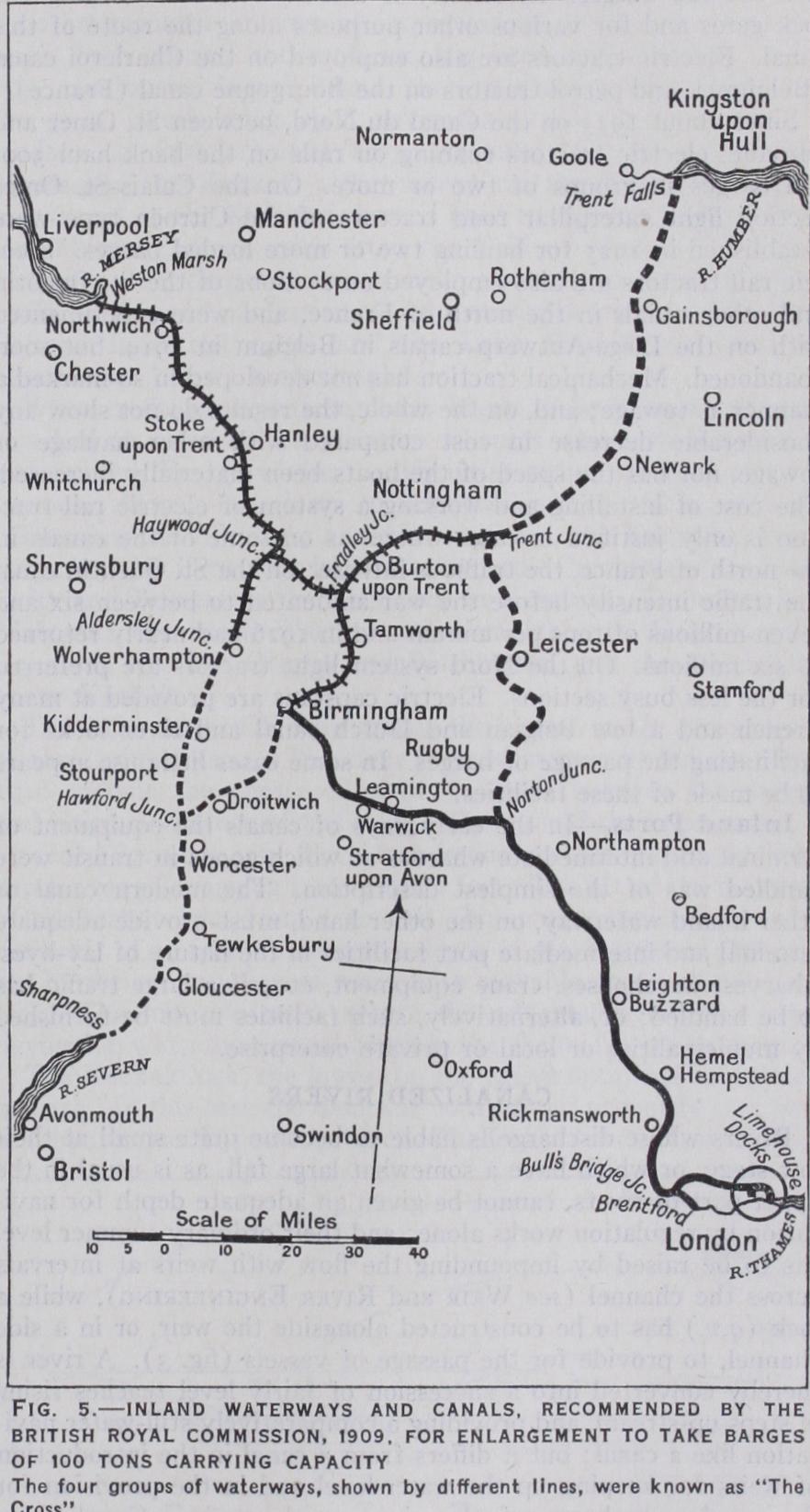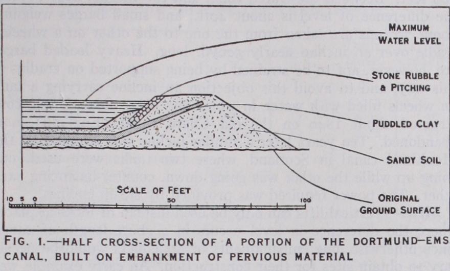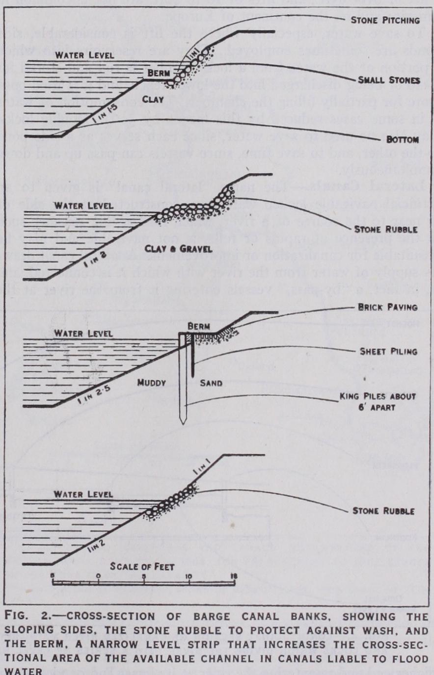 BARGE CANALS Choice of Line.—In laying out a line of canal the engineer is more restricted than in forming the route of a road or a railway. Gradients being inadmissible, the canal must either be made on one uniform level or must be adapted to the general rise or fall of the country through which it passes by being constructed in a series of level reaches at varying heights above a datum line, each closed by a lock, or some equivalent device, to enable vessels to be transferred from one to another. To avoid unduly heavy earth work, the reaches must follow the bases of hills and the windings of valleys, but from time to time it will become necessary to cross a depression by the aid of an embankment or aqueduct, while a piece of rising ground or a hill may involve a cutting or a tunnel. Sharp bends must be avoided, the permissible radius of curves depending on the dimensions of the vessels for which the canal is designed and the width of the waterway.
