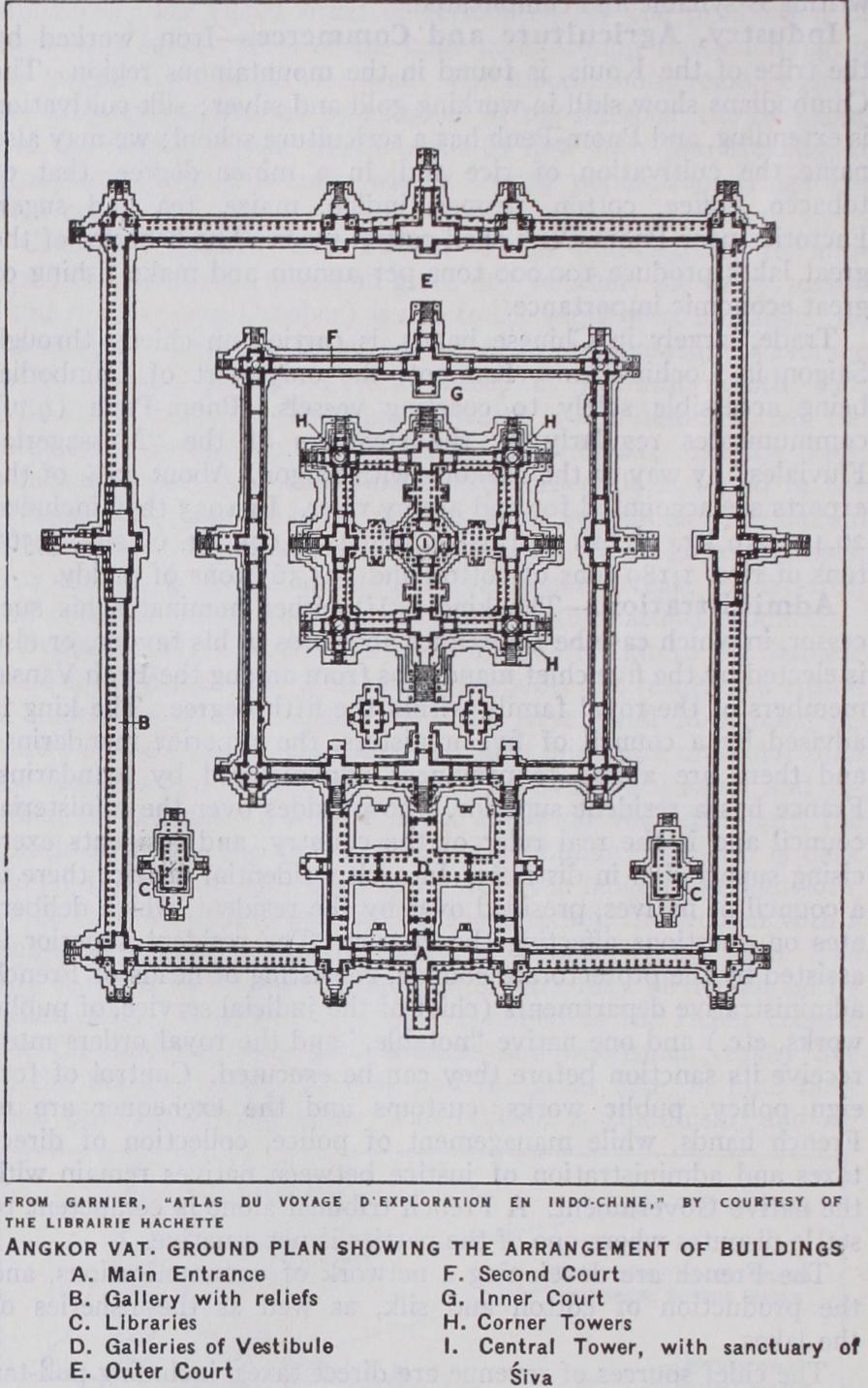 Angkor Thom itself, the ancient Yacodharapura, is a square, surrounded by wall and moat, each side of which is three kilo meters in extent. There are five gateways, from which roads with snake-balustrades lead to the centre of the city. In this centre stands the state temple Bayon. The chief building is surrounded by two galleries provided with portals and turrets and decorated with reliefs. These towers and the gates are cut in the form of four huge human faces, presumably representations of Siva. The cen tral tower, outside which a ring of small chapels are built, is provided with projections. In front there is a network of corri dors and side passages ; the inner chamber contained 8iva's Lingga, while in the chapels both Hindu and Buddhist sacred images are found. The latter, however, were probably introduced at a later date. North of Bayon lie the remains of the palace, in which the royal temple Phimeanakes still stands. Gallery and shrine here arise above three steep terraces. In front of the building runs a great terrace of honour ornamented with reliefs (elephants and others). All this is believed to belong to the most ancient plan of the city. Ta Prohm, to the east, dates from the same time, having a particularly intricate arrangement of projections against the inner gallery, large gateways and ponds. The neighbouring Banteai Kedei, attached to a great pond, while adhering to the leading principles, shows a very mixed ground plan.