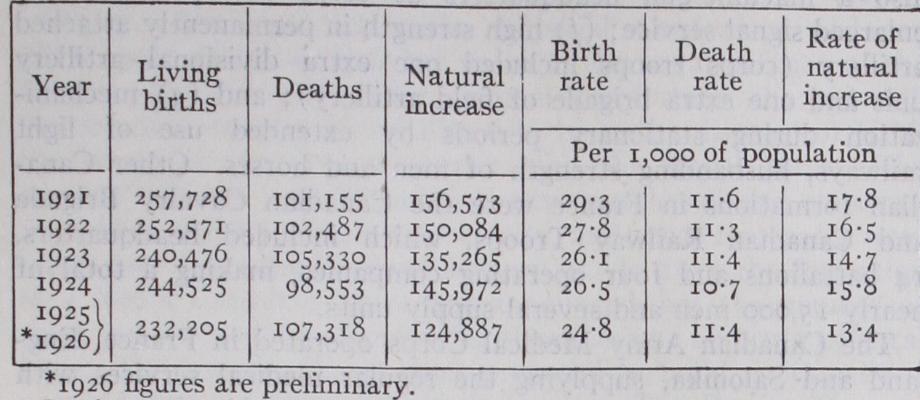 With regard to natural increase, only approximate figures were available prior to 1921. For the intercensal period 1901-1911 the surplus of births over deaths was estimated at 853,566 and for 1911-1921 at 1,150,659. The figures for the nine provinces for calendar years beginning with 1921 were as During 1926 the birth rates ranged from 32-1 per thousand in Que bec to 17.4 in British Columbia, while the rate of natural increase ranged from 17.6 per thousand in Quebec and Saskatchewan down to 7.8 per thousand in British Columbia. About one-third of the present natural increase is due to Quebec.