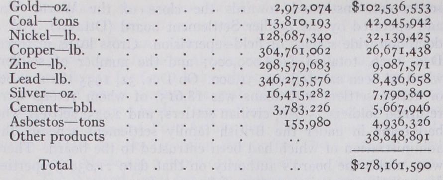 (3) The completion and stabilization of the scheme of soldier settlement, instituted towards the close of the World War and operated by the Soldier Settlement board (Ottawa), with a dominion-wide service of field-supervision. Gross loans in force, Dec. 1926, totalled $108,0o0,000; and the number of soldiers who had been assisted was 31,00o. On Dec. 31, 1935 the number of active settlers with loans was 18,615, of whom 10,68o were returned soldiers; 5,910, civilian settlers; and 2,025, settlers who had come in under the British family settlement scheme, the administration of which had been entrusted to the board. There were under the board's authority on that date 21,038 properties representing a net investment of (4) The growth of the tobacco industry in Eastern Canada, and especially in Western Ontario, under the stimulus of the 25% British preferential rate. Total exports of tobacco, 1922-$1 millions: 1935—$2a millions. Tobacco is more profitable than corn (maize) as a cash crop, and relieves the grower from the loss incurred by the ravages of the corn borer. Over 50% of Ontario tobacco is of the Burley variety, while in Quebec a corresponding percentage is cigar tobacco. One of the exper imental divisions of the Canadian Department of Agriculture is engaged in research upon the major problems of the culture, harvesting, and curing of tobacco. (C. R. F.) Minerals and Mining.—Most of the economic minerals occur in Canada, as might be expected from its great area and varied geology, and more than 6o products were reported in by the Dominion Bureau of Statistics; but only the more important need be referred to. Coal for many years stood first in value until in 1931 it was overtaken by gold. The estimated value of its output in 1935 was $41,888,533. Nova Scotia has bituminous coal of the Carboniferous age, more than half of which lies under the sea. Coke made from it and hematite, also mined beneath the sea in Newfoundland, make the basis of the important steel industry of Sydney. Alberta produces nearly as much coal, but of Cretaceous age and largely lignitic, though the quality improves towards the mountains. British Columbia mines less than half as much as Alberta, most of it Cretaceous, but some of it making excellent coke for the smelters.