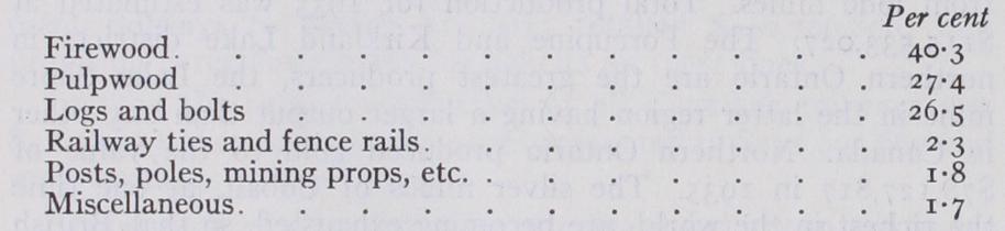The average annual cut of timber from 1929 to 1933 was 2.47 billion cu. ft. The proportionate uses in 1933 were: Although it does not attract much attention, the humble woodlot leads in volume of wood produced. Pulpwood stands second in rank of production, but in value of its products, it far surpasses all others. The total value of all forest products in was 404 million dollars. The forest products are surpassed only by the agricultural as sources of wealth and in 1934 formed 16% in value of all manufactures. Much the greater part of the sawn lumber and the pulp and paper products is exported, chiefly to the United States. The export of the forest products on a valuation basis constitutes one-quarter of the total export trade.