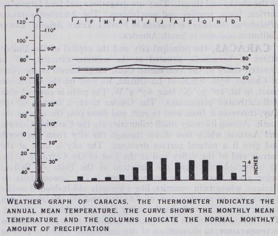 CARACAS, the principal city and the capital of the United States of Venezuela, situated at the western extremity of an elevated valley of the Venezuelan Coast range known as the plain of Chacao, 61m. S.S.E. of La Guaira, its port on the Caribbean coast, in lat. 1o° 3o' N., long. 67° 4' W. The plain is covered with well-cultivated plantations. The Guaira river, a branch of the Tuy, traverses it from west to east, and flows past the city on the south. Among its many small tributaries are the Catuche, Caroata and Anauco, which flow down through the city from the north and give it a natural surface drainage. The city is built at the narrow end of the valley and at the foot of the Cerro de Avila, its topographical centre, the elevation of the Plaza de Bolivar being 3,025 feet. Two miles north-east is the famous Silla de Caracas, whose twin summits, like a gigantic old-fashioned saddle (silla), rise to an elevation of 8,6 2 2f t. ; and the Naiguete, still farther eastward, overlooks the valley from a height of 9,186 feet. The climate of Caracas is subject to extreme and rapid variations in temperature, to alternations of dry and humid winds, to chilling night mists brought up from the coast by the westerly winds, and to other influences productive of malaria, catarrh, fevers, bilious disorders and rheumatism. The maximum and minimum tempera tures range from 84° to 48° F, the annual mean being about 66°, and the daily variation is often as much as 15°. The city is built with its streets running between the cardinal points of the com pass. Two intersecting central streets also divide the city into four sections, in each of which the streets are methodically named and numbered, as North 3rd, or West 2nd, etc., according to direction and location. This method of numeration dates from the time of Guzman Blanco, but the common people adhere to the names bestowed upon the city squares in earlier times. There are several handsome squares and public gardens, adorned with stat ues, trees and shrubbery. The principal square is the Plaza de Bolivar, the conventional centre of the city, in which stands a bronze equestrian statue of Bolivar, and on which face the cathedral, archbishop's residence, Casa Amarilla, the national li brary, general post office and other public offices. The Independen cia park, formerly called Calvario park, which occupies a hill on the west side of the city, is the largest and most attractive of the public gardens. On the outskirts there is the famous "Paraiso" drive. Among the public edifices are the capitol, which occupies a whole square, the university, the cathedral, pantheon, masonic temple, national library, and a number of large churches. The city is generously provided with all the modern public services. The principal water supply is derived from the Macarao river, I 5m. distant. Railway connection with the port of La Guaira was opened in 1883 by means of a line 23m. long. Another line (the Gran Ferrocarril de Venezuela) passes through the mountains to Valencia, IIIm. distant, and two short lines run to neighbouring villages. The archbishop of Venezuela resides in Caracas and has ecclesiastical jurisdiction over the dioceses of Ciudad Bolivar, Calabozo, Barquisimeto, Merida, Maracaibo, Valencia, Coro, Cumana and San Cristobal. There are now some manufactures of note.