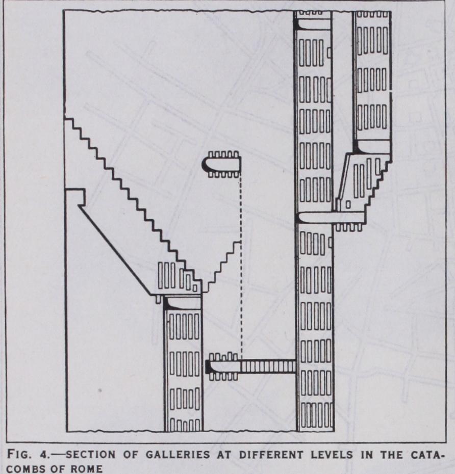 Rome is built upon a rock and the three strata named by gists tufa litoide, tufa granolare and pozzolana have all been ploited. The tufa litoide is ried as building stone. The combs of Rome—the most sive known—are constructed in this stratum alone as it enabled the engineers to form vertical walls for the galleries in which the dead were placed and to work with comparative ease. The pozzolana used as an ingredient for mortar was worked from the lowest stratum so that in spite of old erroneous persistent beliefs the burial places are distinct from the pozzolana, excavated in different strata, though here and there starting from the same level. The catacombs form a vast rinth of narrow galleries usually from 3 to Oft. wide with small chambers at intervals, excavated at successive levels (fig. I). The dead are buried in the galleries in long horizontal recesses in the walls, tier upon tier, even to 12 ranges. The galleries generally run in straight tiers, at the same level, in storeys (seven in one part of the cemetery of S. Calixtus), and intersect at various angles (see fig. 3). The graves (loculi) were usually parallel to the gallery in Christian cemeteries, but in pagan areas the recess was usually at right angles. Some loculi held four or more bodies, most held one (fig. 5). They were carefully closed by slabs of marble or huge tiles cemented together. When an epitaph was set up, it was painted or engraved on these tiles. Table tombs and arched tombs are also found.