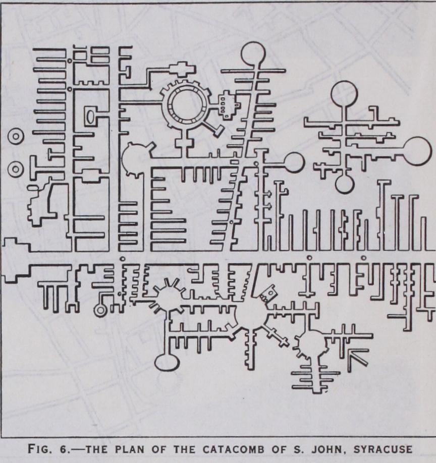 Loculi were cut for later burials in the same family area and the inscriptions and mural decora tions were frequently damaged or destroyed. The funeral feast was celebrated by the family in its vault, both on the day of burial and on the anniversary. The Eucharist, the invariable accompaniment of funerals in the early Christian Church, was celebrated here, and in some of the cata combs are larger halls and connected suites of chapels which may have been constructed for congregational worship in the days of persecution (fig. 4). Baptisteries have been discovered. The catacombs were also used as places of refuge, for which they were admirably adapted, both by the intricacy of their design and by access through secret passages to sand quarries and the open country.