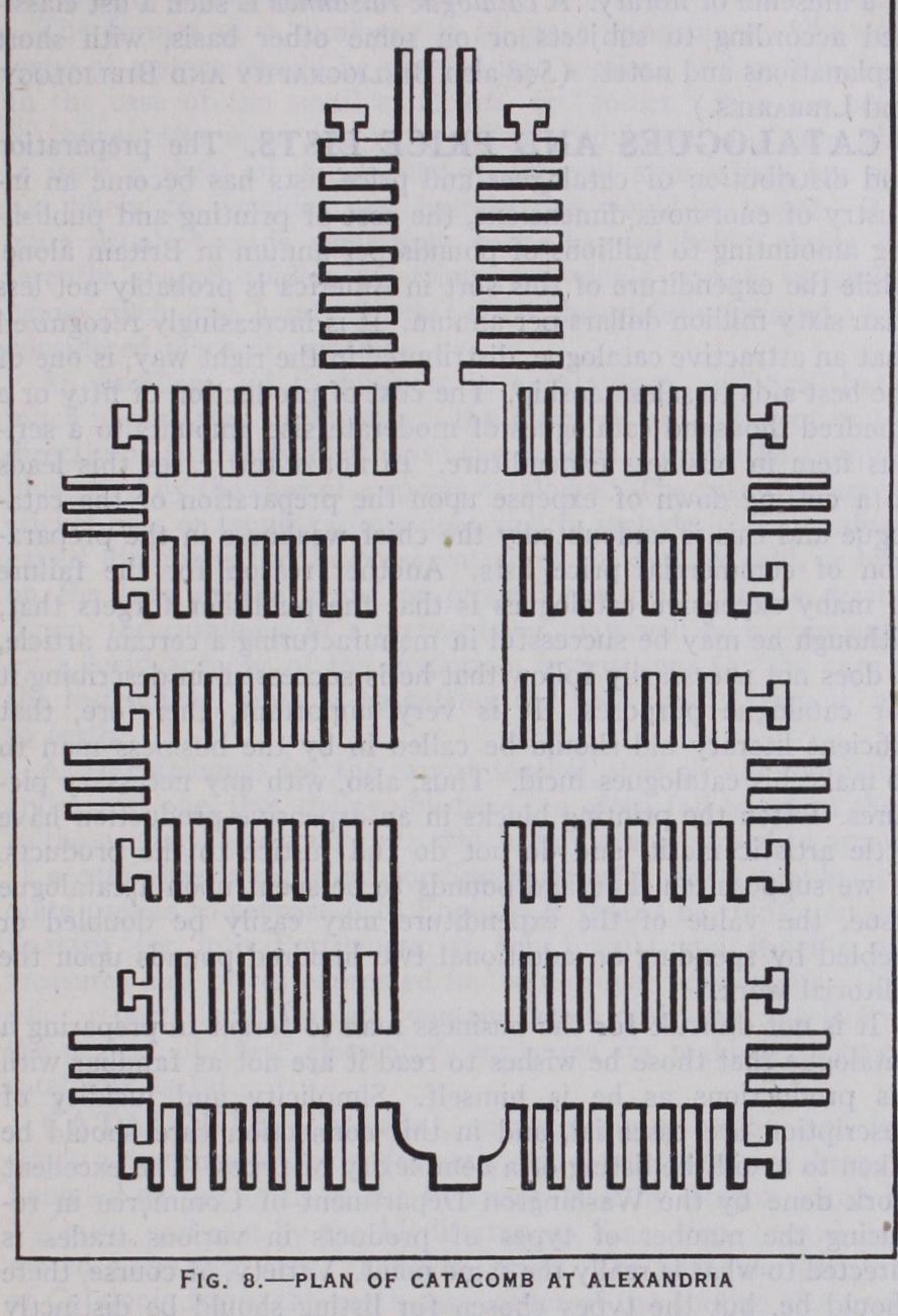 In Egypt we find a small Christian catacomb at Alexandria. The loculi here also are set endways to the passage. The walls are abundantly decorated with paintings, one of a liturgical character. But the most extensive catacombs at Alexandria are those of Egypto-Greek origin, from the largest of which, according to Strabo (lib. xvii. p. 795), the quarter where it is placed had the name of the Necropolis. The plan is remarkable for its regularity (fig. 8). Here, too, the graves run endways into the rock. There are other catacombs in the vicinity of the same city.