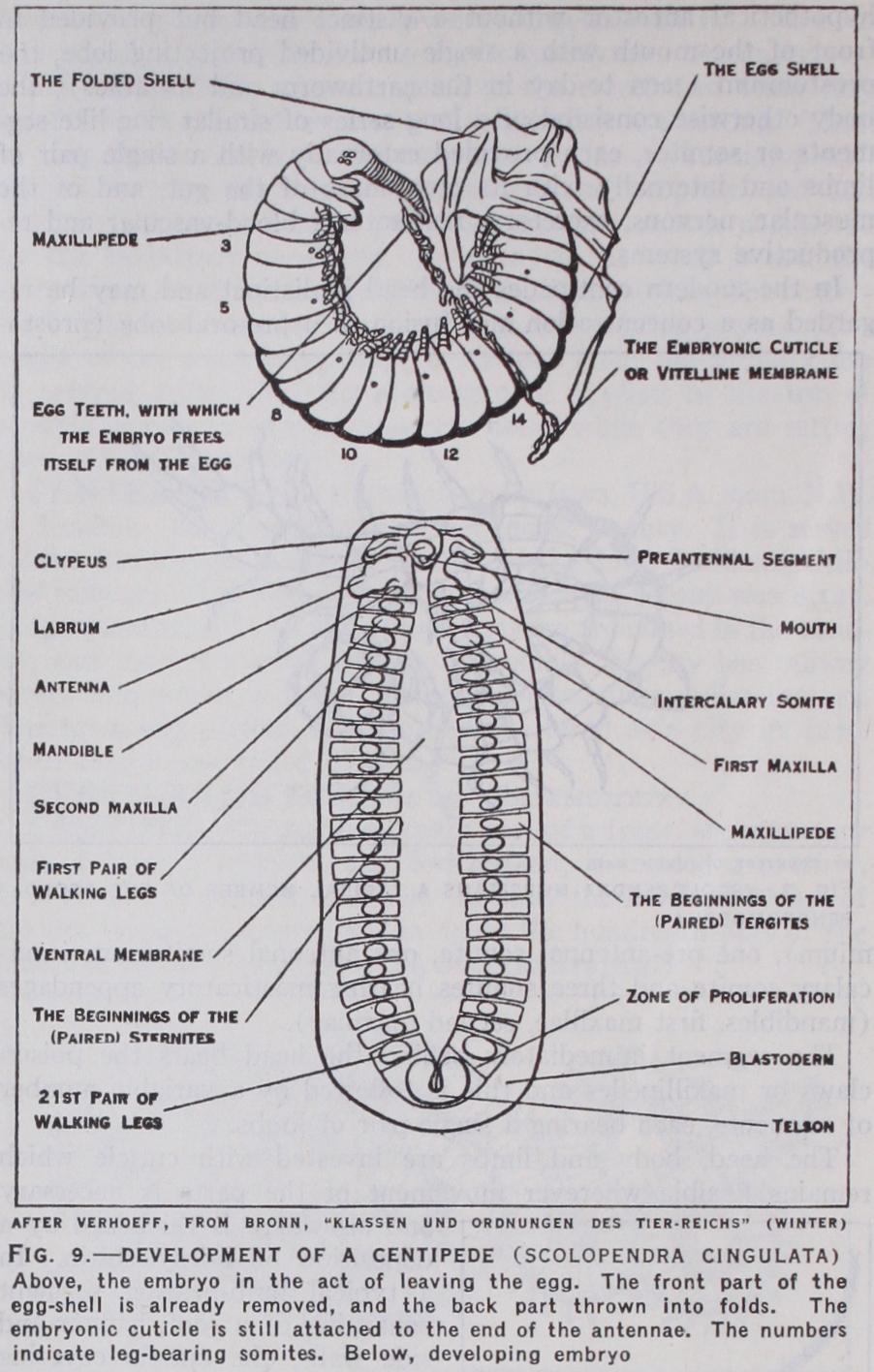 The egg is rich in yolk; this serves as food for the develop ing centipede which grows from a special area in the lower part of the egg. An examination of the developing animal when the proc ess has been some time in prog ress may reveal the beginnings of the various head segments and of the walking limbs. When the animal at length leaves the egg its form varies as already indi cated, according to the order to which it belongs.