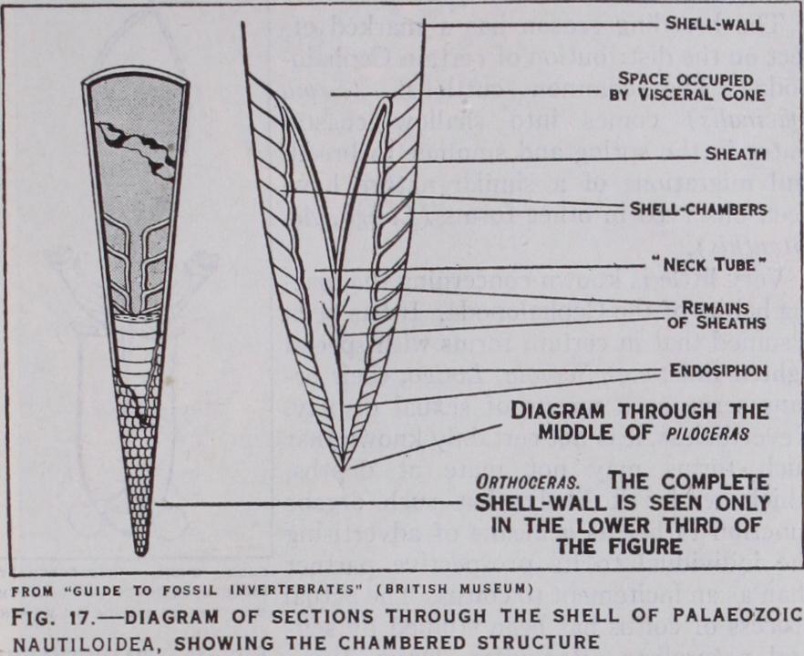 In order to understand the evolutionary history of the Ceph alopoda as revealed by the geological record, it is necessary to allude to the shell of Nautilus, which, by reason of its general or ganization, is regarded as the most primitive living cephalopod. This shell is coiled and subdivided into a number of closed chambers, the last of which is occupied by the animal. Through out the system of chambers runs a median tube, the siphuncle. The earliest forms which we can recognize as cephalopods are found in Cambrian rocks. In Ortlioceras (fig. i 7) we see the unmis takable chambered shell and median siphuncle of the nautiloid.