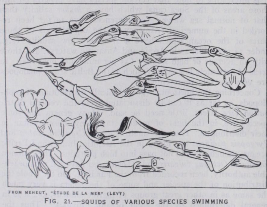 One record is known to the author of an octopod being found living at the mouth of a fresh water stream (Hoyle, go7), and it is interesting to note that certain species have penetrated into those areas of the Suez canal which have a higher salinity than that of normal sea water. No differences have so far been re corded in the numerical frequency of the cephalopods of those parts of the ocean which have a relatively low salinity (e.g., under 34 per mille, as in Arctic and Antarctic waters), and those with an average or high salinity (35 per mille and upwards). In areas of extremely low salinity, such as the Baltic sea, cephalopods are very sparsely represented.