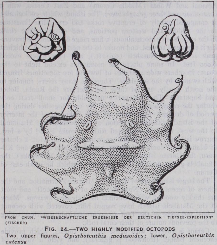 Concerning the horizontal (geographical) distribution of ceph alopods, as far as it can be dissociated from the vertical distri bution (see later), little need be said. Many genera and some species are, in the light of modern taxonomy, cosmopolitan in their distribution. Thus the small egopsids Cranc/iia scabra and Pyrgopsis pacificus are found in the Atlantic, Indian and Pacific oceans, though they do not pass into high latitudes. The common European Octopus vulgaris and 0. macropus have, on unimpeach able authority, been recorded from the Far East. On the whole the distribution of the species and some of the genera is very much the same as in other great groups of marine animals, i.e., it is in general determined by the great oceanic "divides." Thus the Canaries current cuts off a north-east Atlantic fauna from an equatorial and south Atlantic one at about latitude i8°N., and the great "divide" off Cape Agulhas (South Africa) separates Atlantic and Indo-Pacific faunas. Nevertheless, these barriers (due to marked changes in salinity and temperature) seem to be by no means rigid in their effects. Several Mediterranean species are found in the south Atlantic and certain species are common to the Atlantic and Indo-Pacific regions; so that the species can only be grouped into faunas in a very broad fashion. Other quali fications have also to be made. In the first place it is very likely that many species which occur at the surface, e.g., in the cold Benguela current of the south-east Atlantic may be found in deeper water in the Indian ocean, so that the Agulhas "divide" may be only effective at the surface and have a limiting effect only on those Cephalopoda which cannot descend to great depths. Secondly, the identification of species from contrasted areas should depend on a very exact taxonomy, and this is not always easy in practice, as the condition and number of specimens col lected is not always satisfactory. It will be convenient to consider vertical distribution at the same time as the general mode of life of these animals. Nautilus seems to keep near the bottom in the neighbourhood of islands and reefs and has been obtained at a depth of 30o fathoms. It comes into shallow water quite fre quently; but Dr. A. Willey be lieves it breeds in very deep water. The larger Decapoda spend their life swimming at various depths. Some are strictly littoral such as Sepia and Loligo. Most of the Teuthoidea are pela gic, i.e., they live in the open sea far from land, and some of them have a very considerable vertical distribution. Chiroteuthis lacertosa has been taken at a depth of 2,949 fathoms.