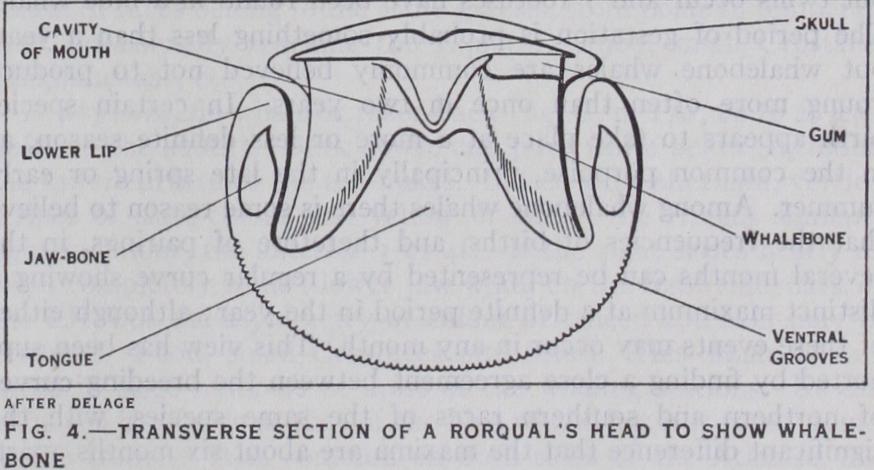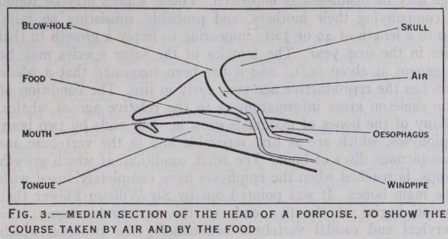The horizontal position of the tail-flukes facilitates rising to the surface and returning to the depths, movements of vital impor tance to the Cetacea. Another effective adaptation to aquatic life is the course taken by the air in passing to the lungs. The larynx and epiglottis form a tube passing through the pharynx into the lower end of the nasal passages (fig. 3). Here it is grasped by the soft palate, and the blow-holes thus become continuous with the windpipe and lungs, the mouth being used solely for feeding—as in recently born marsupials, but not as in other adult mammals, which can breathe through either the nose or the mouth.