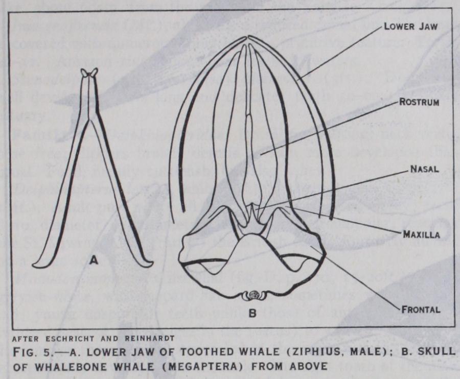 Ziphius cavirostris, Cuvier's whale (26f t.) has one pair of teeth at the tip of the lower jaw, much more massive in males (fig. 5, A) than in females, in which they remain beneath the gum. Cos mopolitan, and not uncommon at certain times along the British coasts.