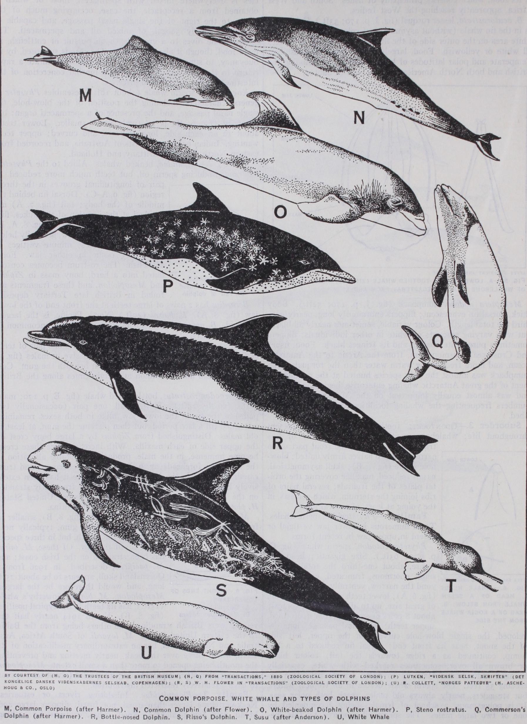 Phocaena and the two following have teeth with an expanded, spade-shaped crown, differing from the conical teeth of other dol phins. P. phocaena, common porpoise (fig. M, p. 172; 51f t. ), is black above and white below, with some variation. Head short, without beak (fig. 1o, D) dorsal fin triangular, commonly with small, horny tubercles on its front edge. Male reproductive open ing unusually far forward, below the dorsal fin ; teeth 2 2-26. The porpoise was formerly much in request as an article of diet, and there were important fisheries off Normandy and at the entrance to the Baltic. It frequents coasts and often ascends rivers. It is specially characteristic of the Atlantic coasts, on both sides, and it reaches the Azores. The porpoise of the Black sea and eastern Mediterranean has been considered distinct. Other species from South America.