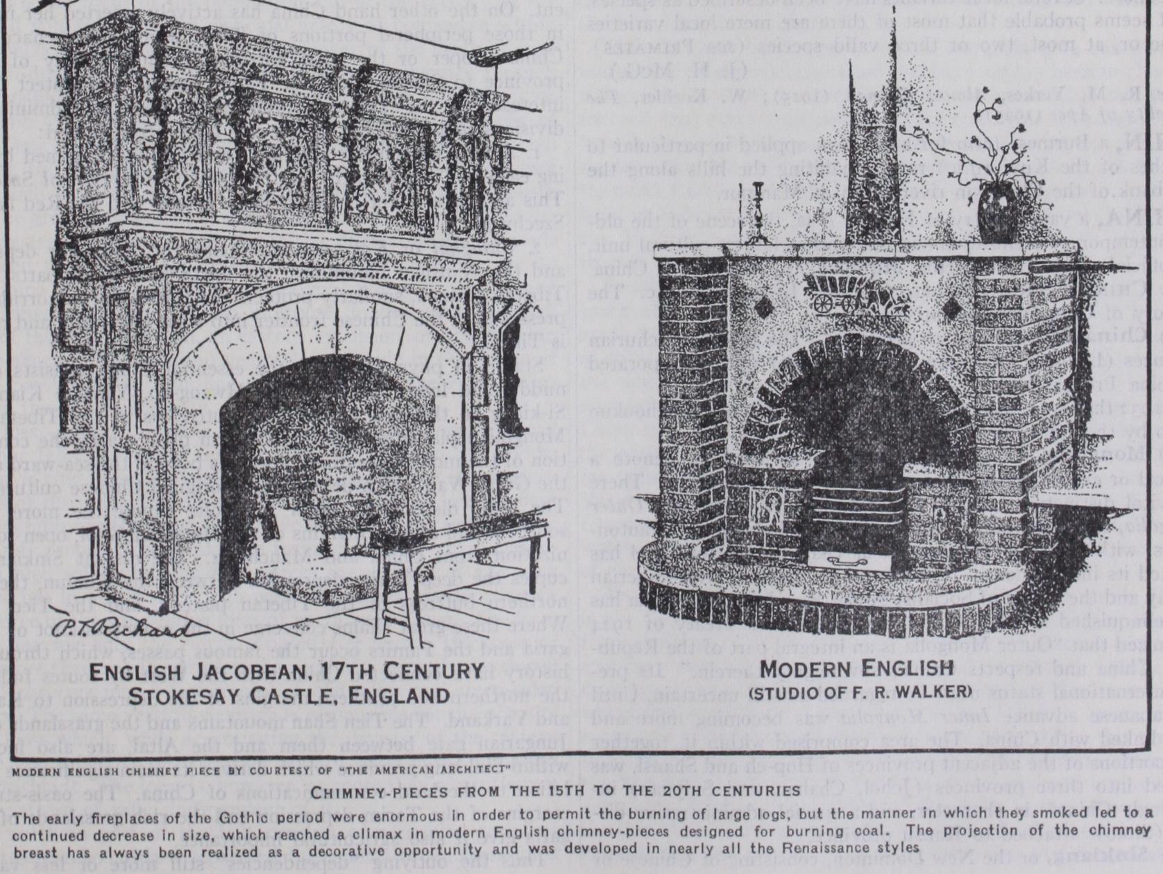 In England the Renaissance chimney-piece was at first treated, with simple architraves, frieze and cornice, in such a way as to serve as mantel shelf, occasionally with rich panelling above, and much breaking or keying of the mouldings. Later, consoles, caryatides and columns were used, although occasionally a simple moulding of sweeping profile replaced the architrave, and the shelf was omitted. In the last half of the 18th century the char acteristic English chimney-pieces, in the style of Robert Adam, owed much to Louis XVI. influence. In American colonial work, there is an almost exact following of English precedent, and occa sional examples can be traced to definite plates in English archi tectural books.