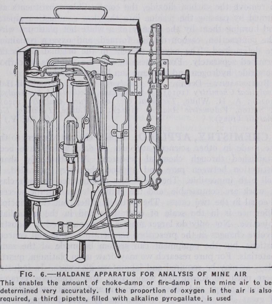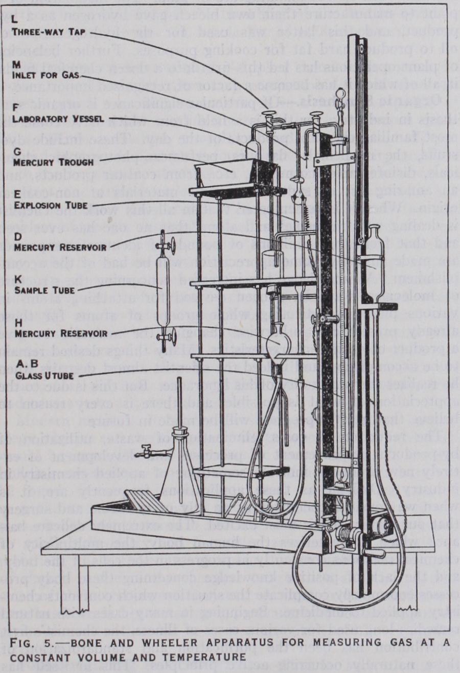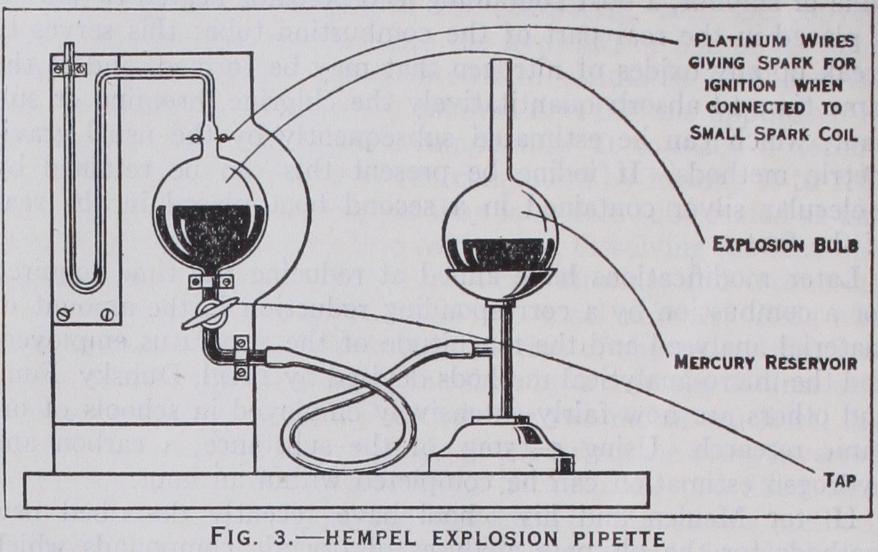 Of the many forms of gas apparatus recommended for these analyses three will now be described in detail—the Hem pel apparatus as a type in which the volume of the gas is measured at con stant pressure, the Bone and Wheeler ap paratus as an example of those in which the pressure of the gas is measured at constant volume and the Haldane ap paratus, employed when some of the im portant constituents are present in very small amounts.