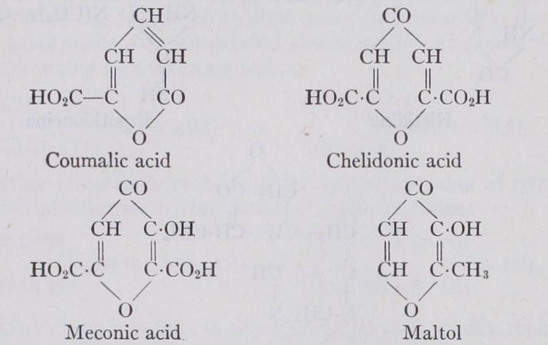 A series of alkaloids accompanies chelidonic acid in many plants and the presence of meconic acid in company with the opium alkaloids (see ALKALOIDS) is particularly significant. Ammonia and perhaps other bases are admittedly present in all plants at some stages of growth, and this, together with the pyrones, which are particularly abundant in some plants that elaborate alkaloids, may supply the needed starting products for the vital synthesis of pyridine bases. a-methyl-O-hydroxy-y pyrone (or maltol) occurs in the needles of pines and the bark of larches, and is also formed on roasting malt.
