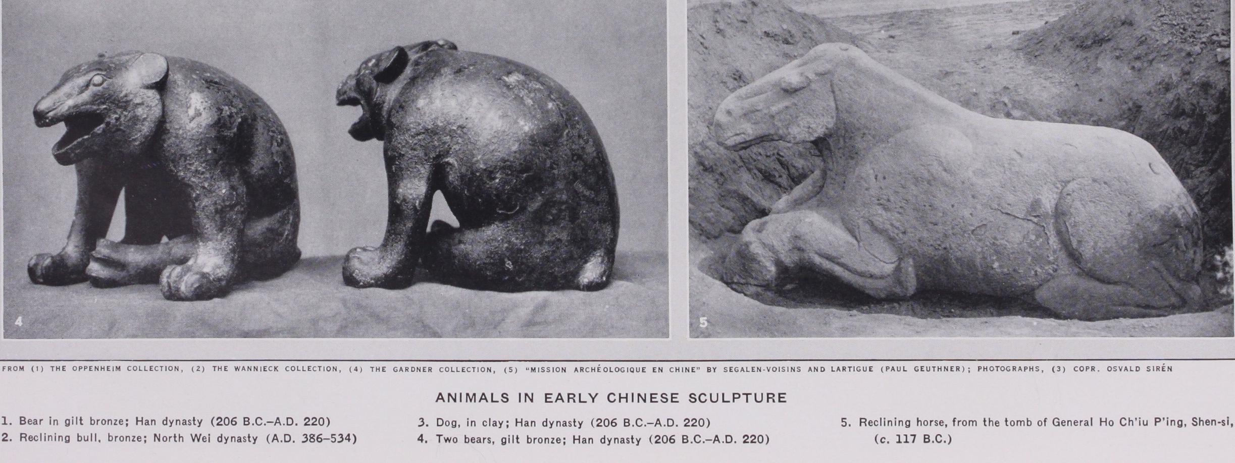 Animal Sculptures of the Six Dynasties Period.—During the centuries which followed the fall of the Eastern Han dynasty (A.D. 214) artistic activity in China lost some of its intensity. The times were restless, filled with war and political upheaval. The empire was again divided into several minor States, to be gin with, the Three Kingdoms, Wu, Shu and Wei, and later on, after 223, into a northern and a southern half, the former being under the domination of the Tartars, among whom the Toba tribe came out the strongest and took the name of the Northern Wei dynasty, while the latter was ruled over by a number of short-lived native dynasties—Sung, Ch'i, Liang and Ch'en which had their headquarters at Nanking. We know very little about the artistic activity during these times but it seems that the stylistic traditions of the Han period remained in force also dur ing the 3rd and 4th centuries of our era. Some tomb reliefs, mainly from Shantung, executed in a kind of coarser Han style, may well be of this transition period, and the same may be said of a number of minor plastic works in bronze and clay.