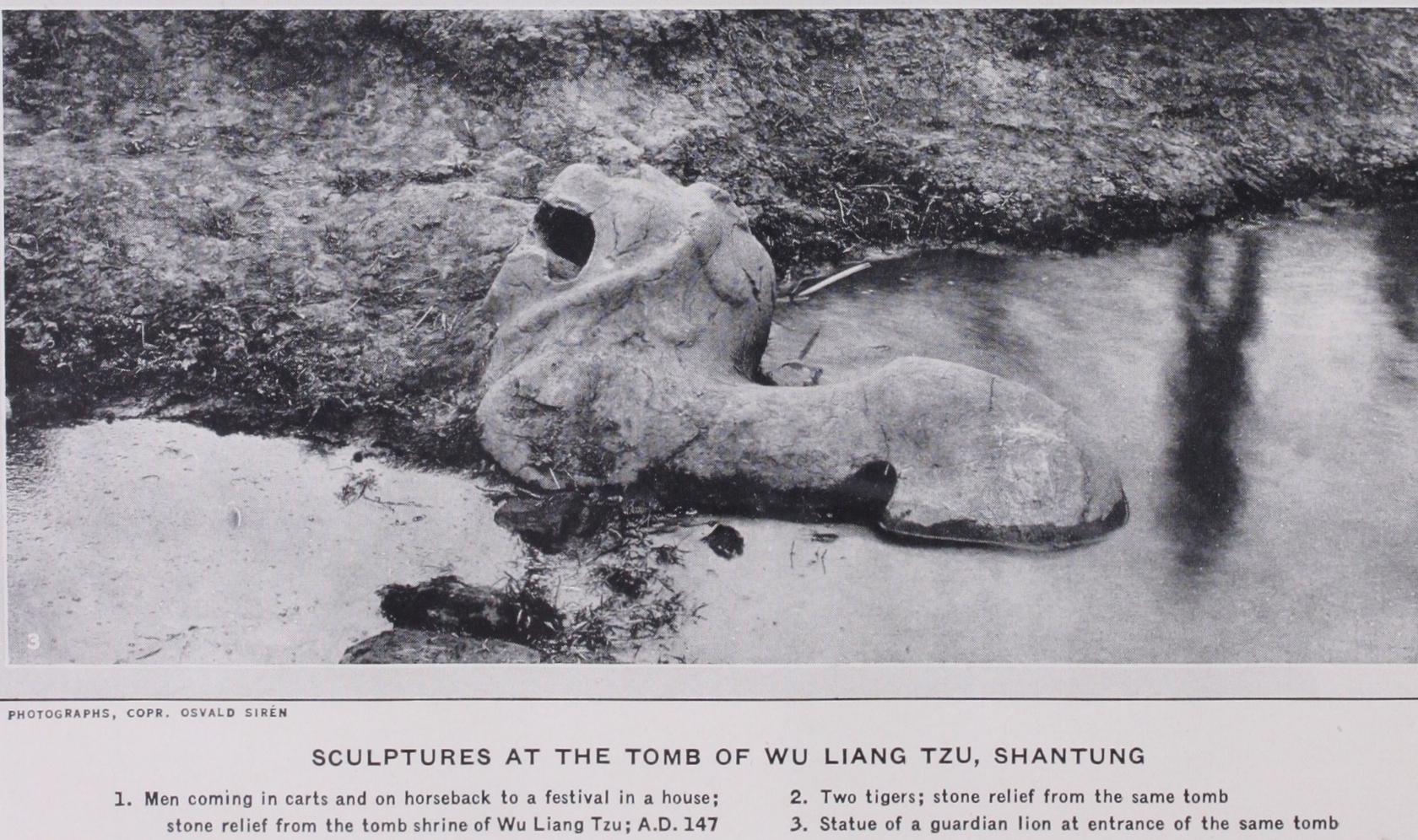 Much simpler than these are the pillars which stood at the entrance to the tomb of the Wu family at Ch'ia Hsiang in Shan tung. They were erected about the year A.D. 147 and they are still in their original place, although the tomb-area has become a large pit, usually filled with water. The pillars are provided with buttresses and a small superior storey on the projecting roof, but their sculptural decoration consists simply of quite low reliefs representing dragons, tigers and birds, in decorative trans lation, besides legendary illustrations with a moral import, framed by geometrical ornaments of the same kind as may be found for instance on the mirrors of the Han period.