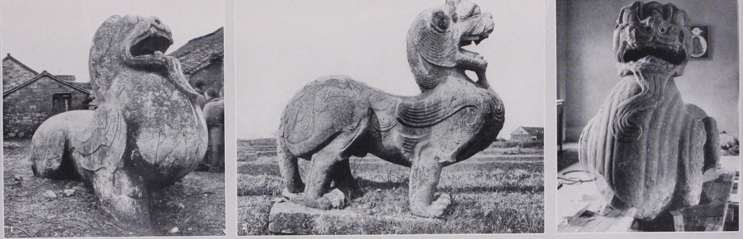 Lions of Hsiao Hsiu Tombs.—Better preserved and more completely visible are the two colossal lions at the tomb area of Hsiao Hsiu, now covered by the village Kan Yu Hsiang, and here remains one row of the other monuments which flanked the "spirit road," i.e., two large tablets with inscriptions carried by tortoises and a fluted column on a plinth composed of winding dragons. This seems to be the earliest preserved "tomb alley" in China, an arrangement known from a great number of later tombs. The lions are of the same family as those already de scribed, the fact that they have wings is in itself a proof of their dependence on Persian art. It should, however, be remembered that the Achaemenian and Sassanian animals were descendants of the Assyrian which must be regarded as the fore-fathers of all the greatest Asiatic and a good many European lion sculptures. To what extent the Chinese really knew such models is a ques tion which cannot be discussed here ; it is in any case evident that they transformed the foreign models quite freely, not to say fantastically, in harmony with their native traditions. These animal sculptures form stylistically a direct continuation of the plastic art of the Han period. Yet, they indicate that a new wave of Western influence reached China at this time on a more south ern route than through the north-western nomads. These lion sculptures do not appear in the northern provinces which were dominated by the Tartars. They belong to the more southern provinces where the old Chinese civilization and the creative spirit of the "Han people" never were completely subdued by foreign elements.