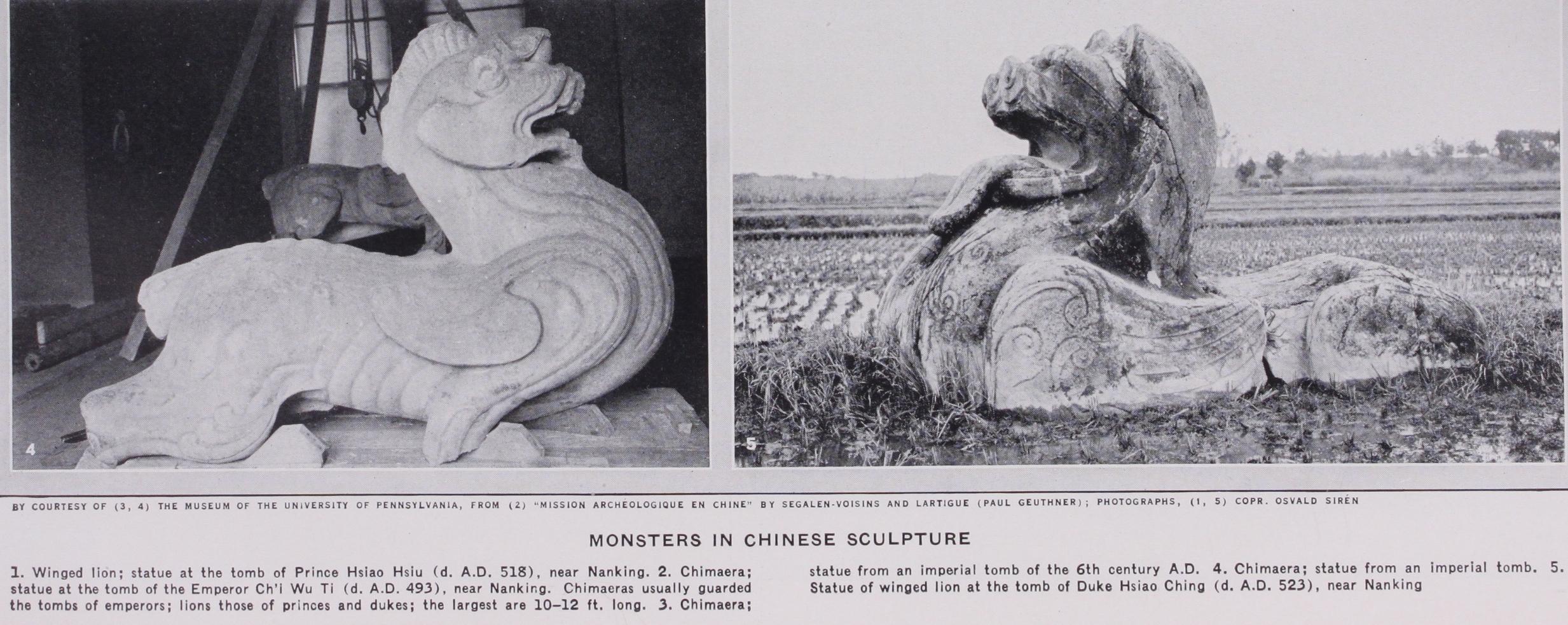 The earliest chimaera which can be dated stands at the tomb of Emperor Sung Wen Ti (d. 453) . It is a colossal and, in spite of its dilapidation, still imposing animal, largely covered up by a heap of refuse, so that the statue had to be dug out whenever it was photographed. The upper part of the head is lost and the surface of the grey limestone is very much worn but it is still possible to see that the body as well as the legs have been covered by ornamental scales or feathers and that the animal had wings not only at the shoulders but also at the ears.