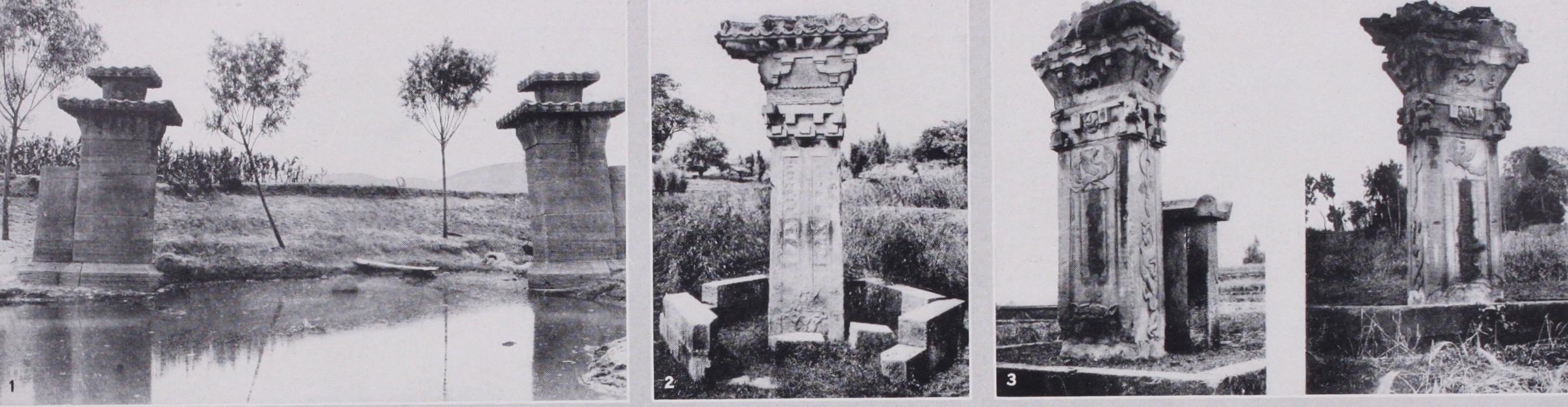 Quite a number of the decorative pillars which formed the gateway to the "spirit road" are known from central and western China, particularly the provinces of Honan, Shantung and Szechuan. They are usually constructed on a rectangular plan of large and well-fitted stone blocks reaching a total height of 5 to 18 feet. When completely preserved they consist of a moulded pedestal, a very broad shaft and a cornice over which the roof projects quite far. But the form varies somewhat in the different provinces; thus the pillars in Honan, of which the best known stand at Teng Fung Hsien on Sung Shan, are very broad and provided with projecting buttresses. Otherwise they are quite simple without any particular development of the cornices and decorated with ornaments and figures in very low relief. The earliest of these Honan pillars is dated A.D. 118, the latest A.D.