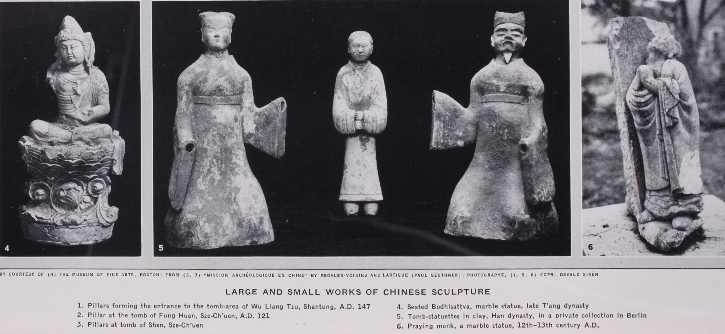 The majority of the tomb pillars in Szechuan, of which at least a score were dis covered by Segalen and Lartigue during their exploration in 1914, show the above mentioned combination of friezes with flat reliefs and tridimensional representations of animals and human figures on the entablature. The motives vary, some being histori cal or legendary, others religious or mythological, but they are all more or less imbued with a dramatic expression, and executed in a form of high decorative beauty.
