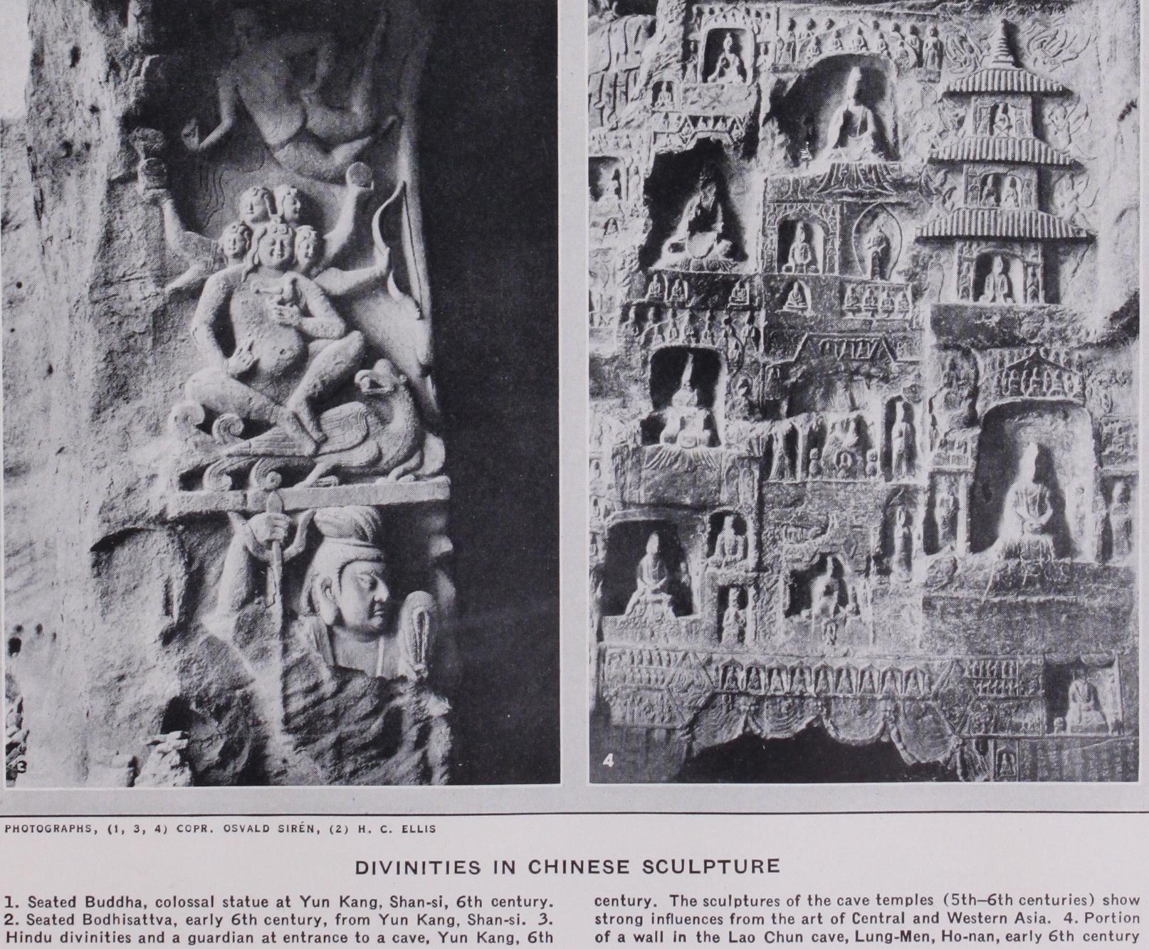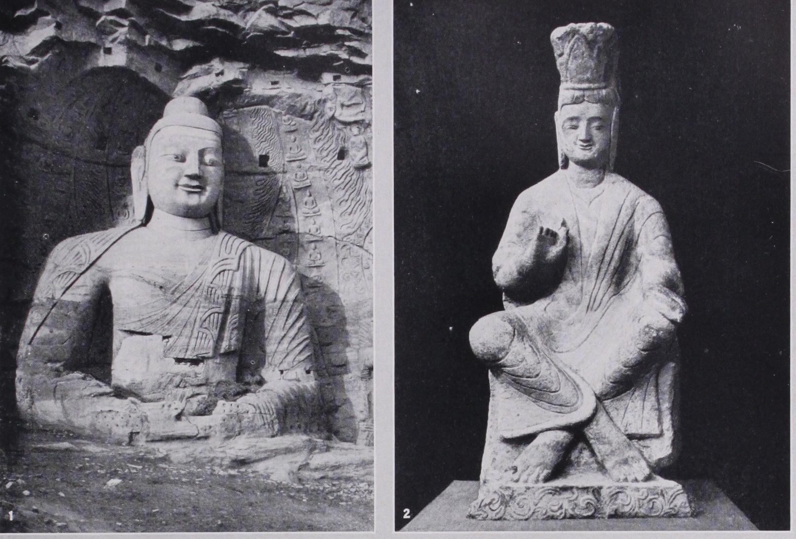 The greatest ensemble of early Buddhist sculptures in China is to be found at the Yiin Kang cave temples near Ta Tung Fu in Shansi where the Northern Wei dynasty had its capital until 494, when it was removed to Loyang in Honan. The work at these cave sculptures started about the middle of the 5th century and was continued towards the latter part of the 6th century. Amongst the rich material displayed at this place one may observe different stylistic cur rents, some originating from Central Asia and India, others more closely connected with earlier forms of Chinese art. Here are ornaments of a distinctly Iranian character, and architectural forms of the same type as on reliefs from Taxila and Peshawar, but also some decorative motives recalling the art of the Han period. Among the figures there are some curious examples which form a' link with Central Asiatic art, e.g., the five-headed and six-armed god who sits on a large bird with a pearl in its beak. This is no doubt the Garuda-raja, the bird of Vishnu, which also may be seen in some paintings from Tun Huang. This and other Hindu divinities of a similar kind, which appear in the Buddhist pantheon at Yiin Kang, testify that artistic influence from central and western Asia reached China in connection with the introduc tion of Buddhism.