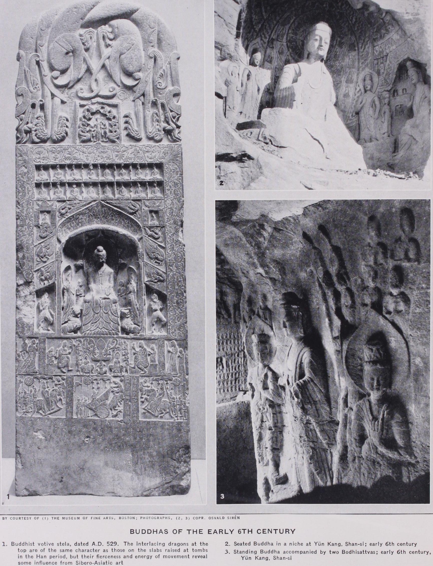 Besides these cave sculptures of the Northern Wei period should be mentioned a large number of Buddhist stelae, i.e., slabs with figures in high relief, varying in size, some up to 12 ft. high, others quite small. Their decoration consists generally of a combination of niches with Buddhist figures and ornamental borders. On the back of these slabs are often found long rows of figures in flat relief representing the donors of the monuments. This form of stelae was probably de veloped from the earlier type of inscribed memorial stones, as used in China since the Han dynasty. It is worth noticing that we find at the top of the Buddhist stelae the -same kind of wind ing and interlacing dragons as on the slabs which were raised at the tombs; their fierceness and energy of movement seem to reveal their derivation from the Sibero-Asiatic art, based on Scythian traditions which, indeed, had a great influence on the development of the ornamental style of this period.