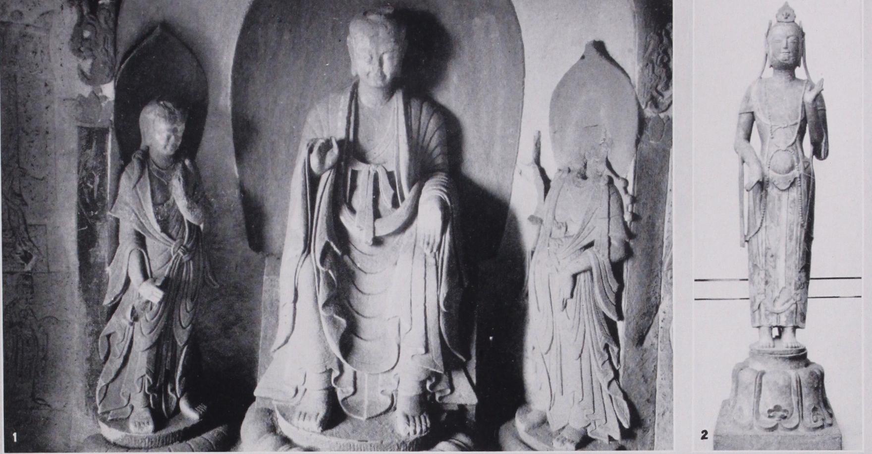 The earliest sculptures at T'ien Lung Shan are to be found in the caves no. 2, 3, 10 and 16, probably executed between 56o and 580. The system of decoration in the first two caves consists of three large groups, one on each wall representing a seated Buddha accompanied by two Bodhisattvas and, in some instances, also by adoring monks and donors, characterized with striking realism. The main figures are executed in very high relief, giving almost the impres sion of free-standing forms, yet there is a certain flatness about them, noticeable particularly in the Bodhisattvas which stand turned half-way towards the central Buddha and whose garments —arranged in pleated folds—spread out in wing-like fashion at the sides. They are not very far removed stylistically from cor responding figures on later Wei monuments, though their heads are less archaic both in shape and expression.