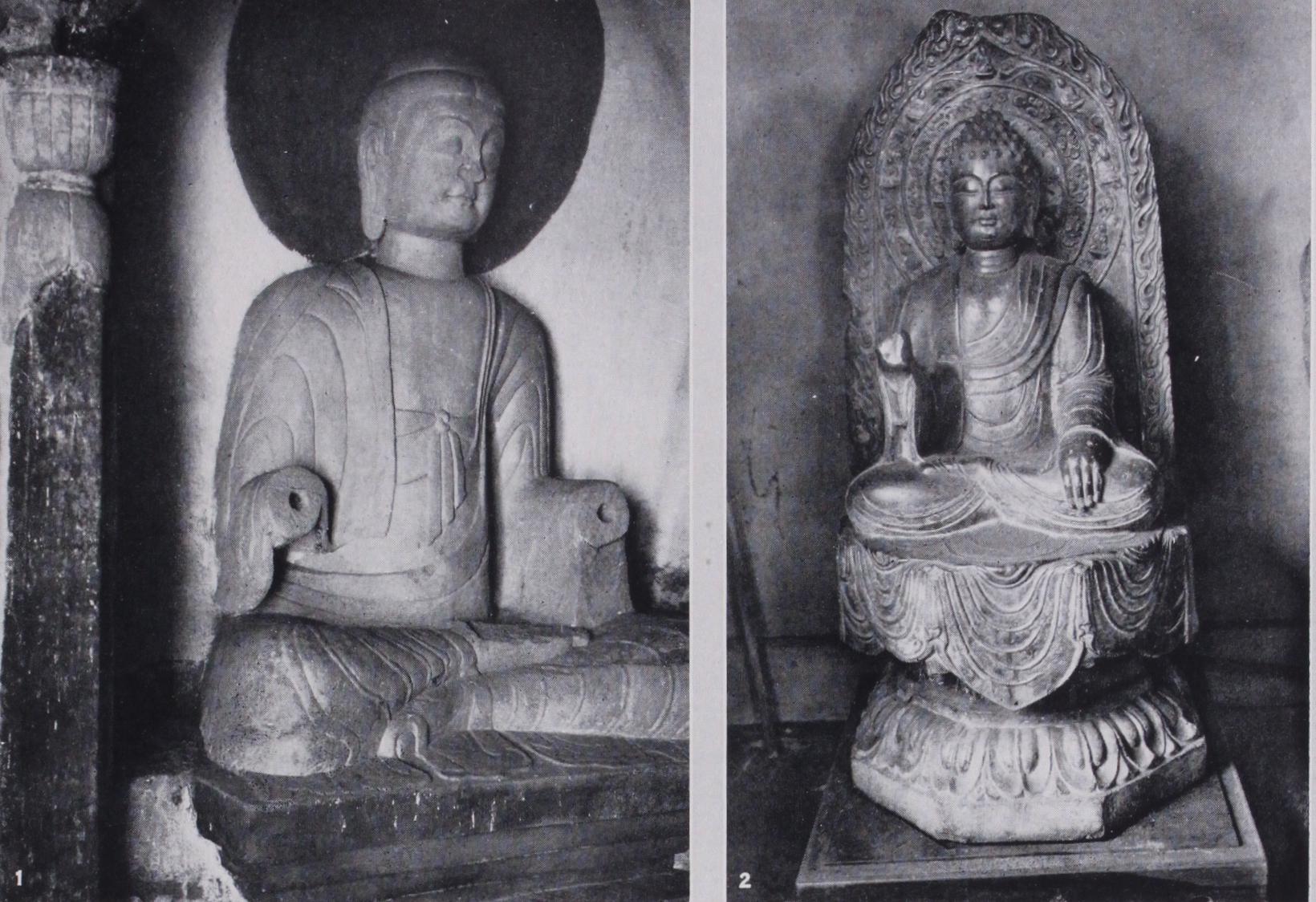 The earliest dated Buddhist sculptures in China, known to us, are small bronze statuettes of a greater historical than artistic im portance. Some of them are provided with inscriptions which make it possible to fix their date, the earliest being of the years 437 and 444, whereas the earliest dated Buddha in stone is of the year 457. These small statuettes represent standing or seated Buddhas or Bodhisattvas against a leaf-shaped nimbus decorated with engraved flame-ornaments. The figures are mostly of a very moderate artistic importance recalling by their types and draperies the Graeco-Buddhist art of north India. The large nimbuses behind these small figures constitute, however, a feature which is not known in Gandahara sculpture.