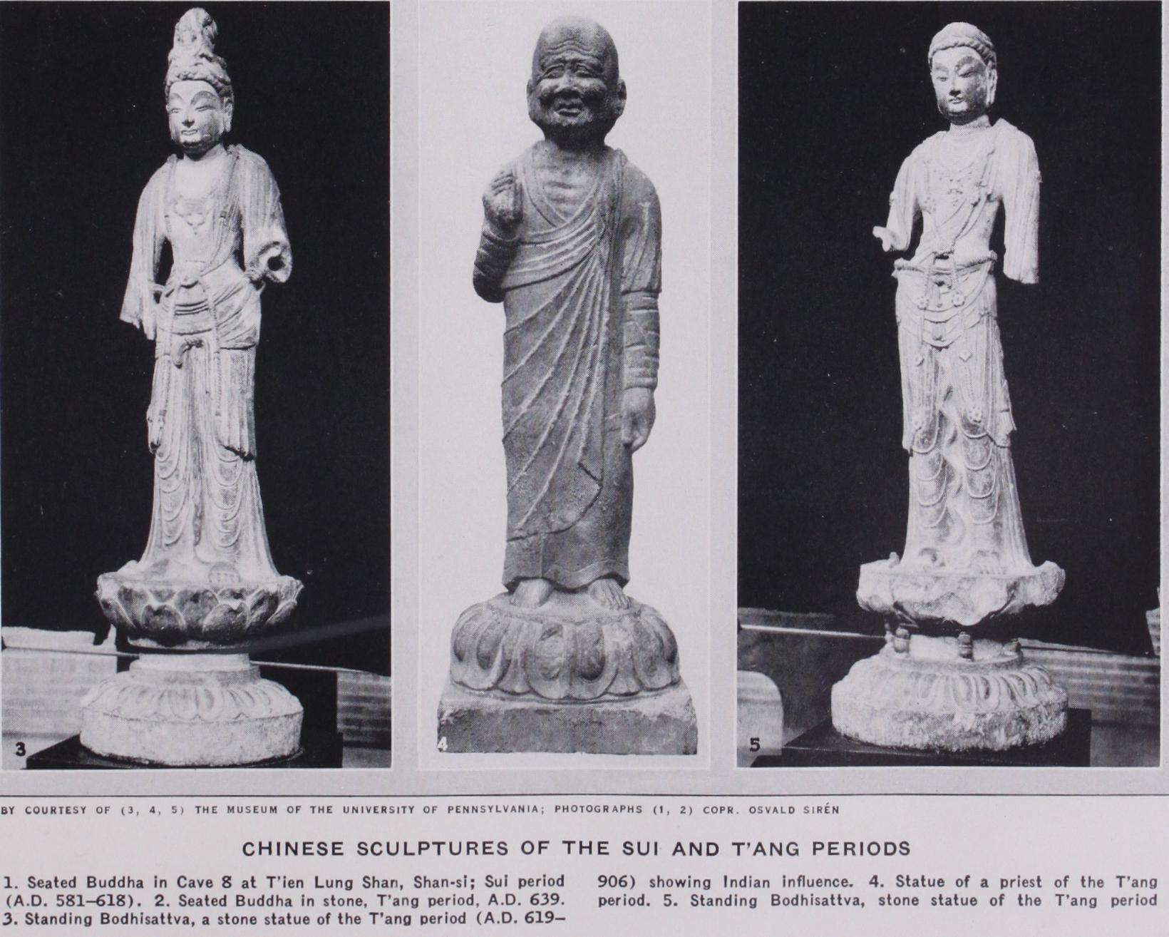 The sculptures of the Sui period (581 6 i 8) form, stylistically, a direct continuation of those of the transi tion period during the Northern Ch'i and Chow dynasties. Most of them are still examples of the transition style, but a few may well be classified among the most perfect works of religious statuary in China. Conditions were particularly favourable for the flourishing of religious art, and the formal development had not yet passed the point where it becomes an end in itself. Sui sculp ture is, on the whole, quite restrained in its formal modes of ex pression and its interest in nature is slight, but it marks neverthe less a distinct progress in the representation of actual forms.