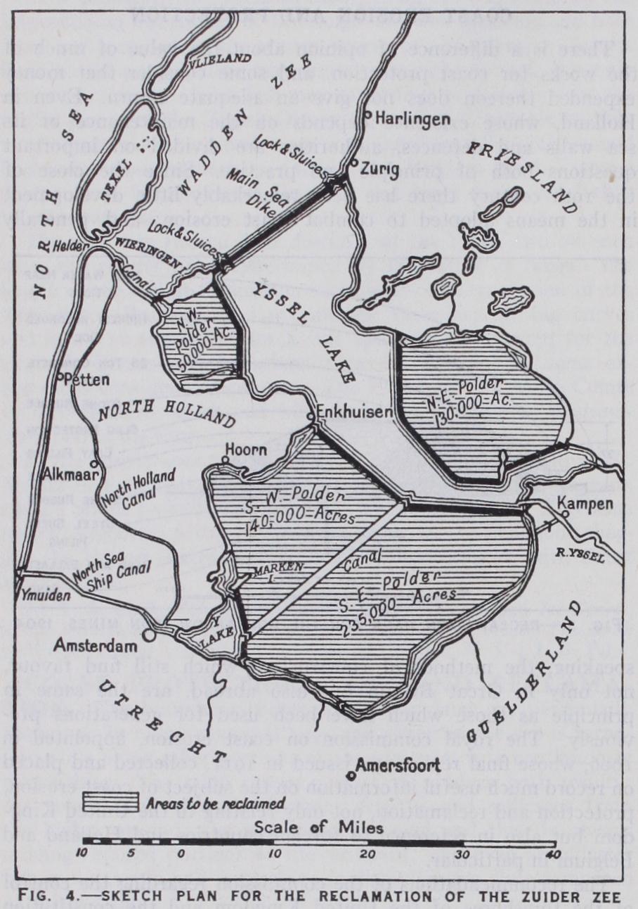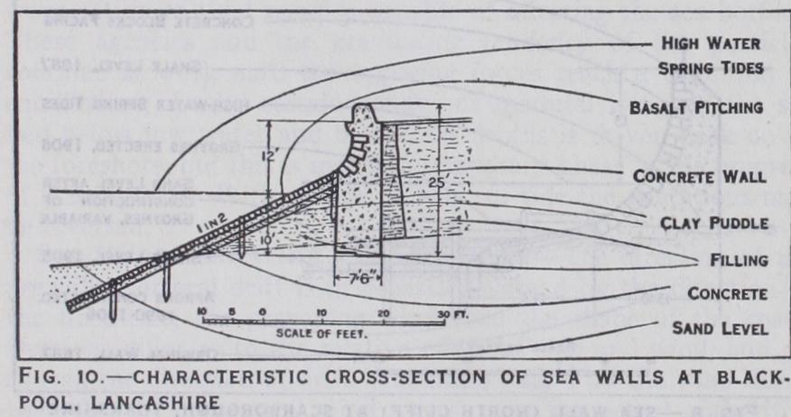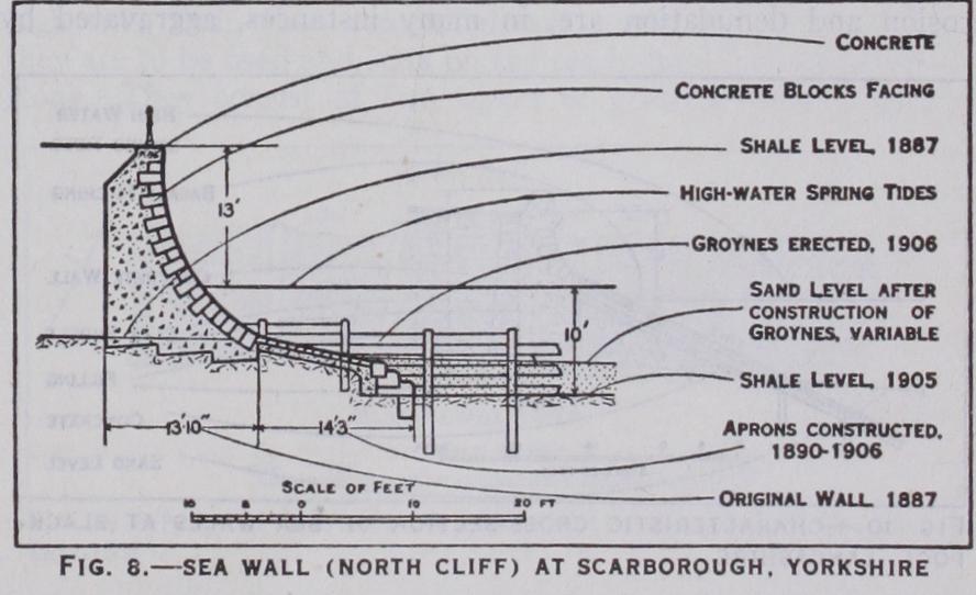 Upright sea walls, with some batter on the face, have been constructed along the frontage of many sea-side towns, with the double purpose of making a promenade or road, and of af fording protection. A very slop ing and also a curved batter reduces the effective stroke of the wave by facilitating its ris ing up the face of the wall, but the force of the recoil is correspondingly augmented. A vertical face offers more direct opposition to the wave, min imizes the tendency to rise and, consequently, the recoil ; while a stepped face tends to break up the wave both on ascending and recoil, but there is a corresponding liability to displacement of the face blocks of the wall. The sea walls shown in figs. 6, 7 and 8 exhibit straight, stepped and curved forms of batter. The building of the Scarborough wall (1887) was followed by erosion of the shale bed on which it was founded, and further protective works, including aprons and groynes, had to be added subsequently. A sea wall at Bridlington, constructed in 1888, and, like the walls at Hove and Scarborough, protected by groynes, is shown in fig. 9. At Blackpool walls of the Dutch type but with somewhat steeper aprons have been built on an extensive front (fig. i o) .