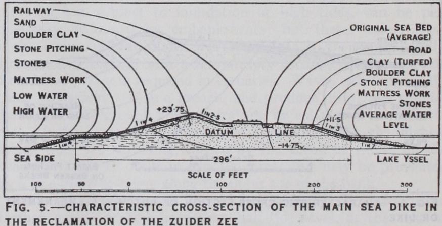 Sea Walls.—The conditions affecting the design of a sea wall differ so materially that every case must be considered on its merits and provided for accordingly. Sea walls may be divided roughly into two classes, sloping and upright, each class having its advocates among engineers. Generally speaking, walls having a sloping face are used in Holland and Belgium, whilst a vertical or nearly vertical face is more common in Great Britain. The immediate effect of the construction of a wall is detrimental to the beach in front of it, although affording protection to the cliff or banks behind. Thus the construction of a sea wall on a sand or shingle foreshore is in itself calculated to bring about the denudation of the beach and the wall may become before long the agent of its own destruction. Whilst the wall will prevent erosion by the sea of the cliffs in rear of it, the beach in front of the wall must be protected and conserved by the construction of groynes. Many walls have failed through the displacement of the filling behind them by wave action; the provision of a substantial and wave resisting surface or paving behind the wall is, therefore, of great importance, and has been too often neglected. Suitable provision for the drainage of the cliffs, where they exist at the back of sea walls, is also a matter of high importance which also has often been neglected with disastrous results. Much can undoubtedly be done by draining, sloping and planting, to preserve and protect cliff faces, and these works ought to proceed simultaneously with the carrying out of sea-defence undertakings, when the cost of the latter is justified, to protect the foot of the cliff.