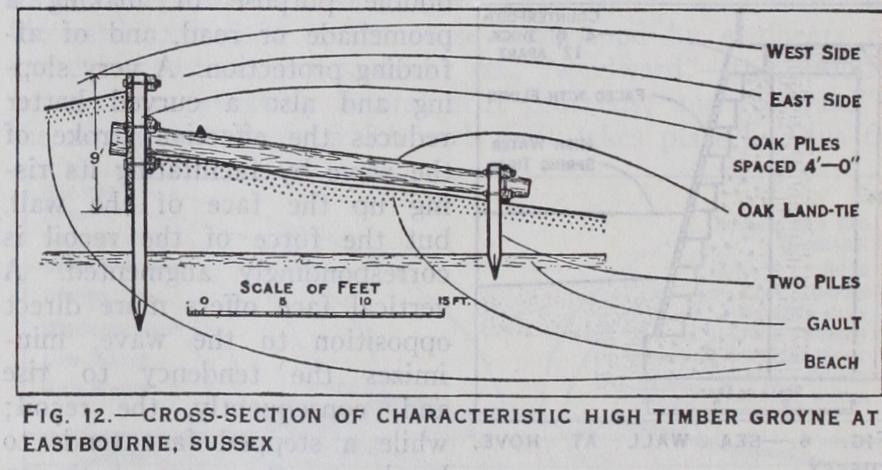 Groynes although, in Britain, usually constructed of timber are sometimes built of concrete or masonry; examples are the high groynes at Brighton and Hastings (fig. II), which are faced with flints to protect the concrete from abrasion by shingle. A typical high timber groyne at Eastbourne is shown in fig. 1 a and a low groyne of lighter construction in fig. 13.