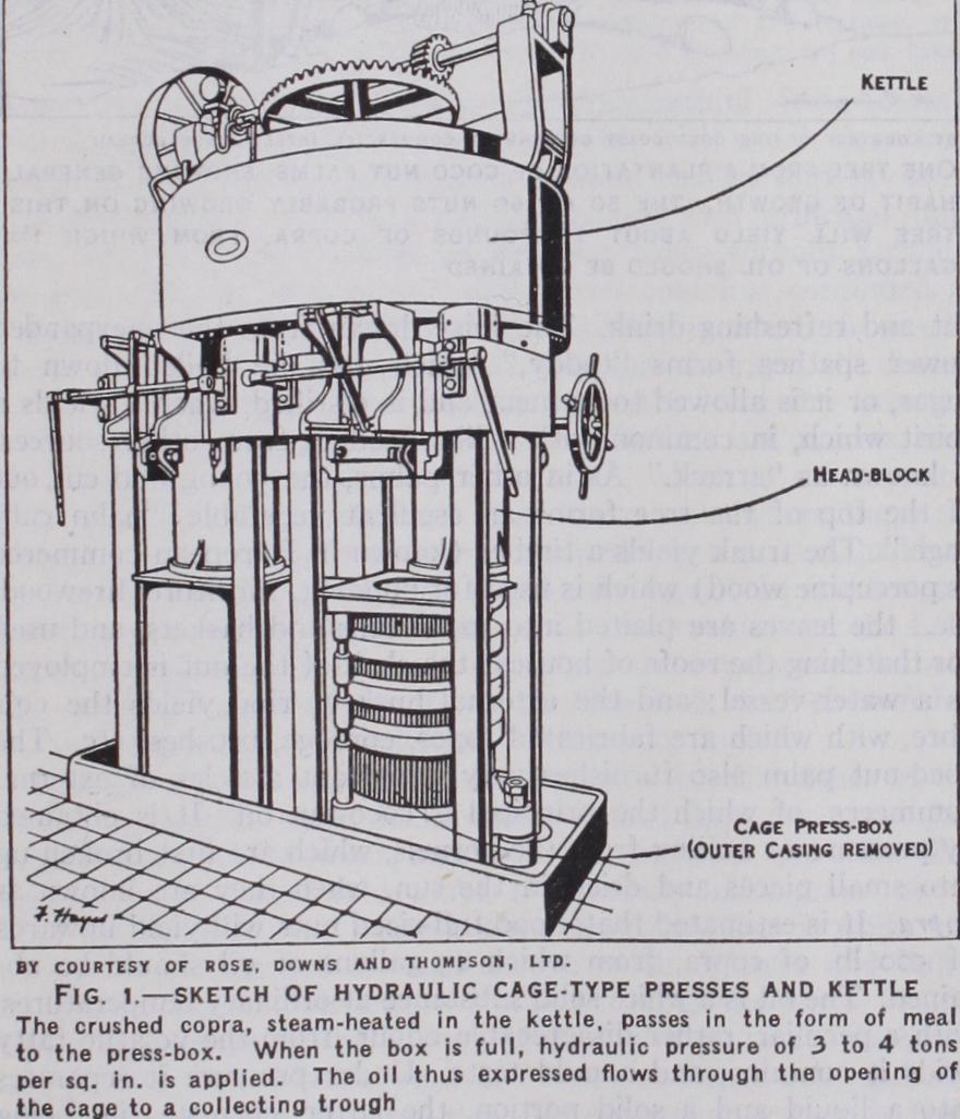 The "cage," or "clodding," press consists of a circular box built up of steel staves held in position by steel hoops ; the staves almost touch one another, but the oil can flow through the inter stices while the meal is retained. The "cooked meats" are sepa rated by flat mats of wool or hair and are compressed by the rising hydraulic ram. As the mats have to bear very little strain, there is a large saving in wear of press cloths in the cage press as pared with the Anglo-American press. This machine, also known as a "plate press," consists of a number of rectangular plates, between which the meal-cakes (wrapped in cloths or bags) are placed, and which are forced gether by the action of the ram. This type of press yields more coherent cakes and is used for the final pressing, but the cage press is to be preferred for the first pressing of a material so rich in oil as copra, since there is less tendency for spueing of the meal.