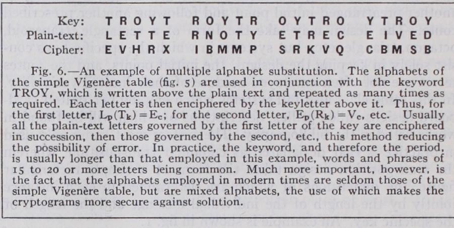 Polyalphabetic substitution systems may be classified as peri odic or aperiodic, depending upon whether or not the crypto grams produced by them exhibit external phenomena of a cyclic nature. Periodicity is exhibited externally whenever the substi tution process involves the use of repeating keying elements which operate in conjunction with a constant number of cipher alphabets. Periodic systems may be further classified into multiple alphabet and progressive alphabet systems. In the former type only limited numbers and specific members of the complete set of alphabets pertaining to the system are employed in a single message, the number, sequence and identities of the alphabets being governed in each case by the key, which is repeated as often as necessary to encipher the message. An example is shown in fig. 6.