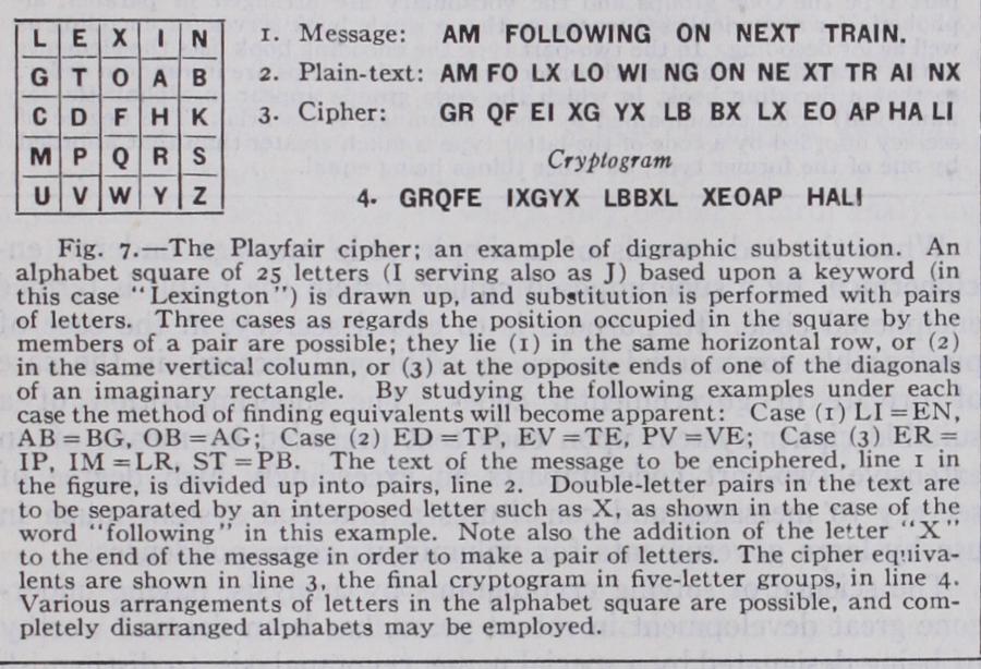 The various systems of substitution thus far mentioned are monographic in nature, involving single letters ; in digraphic sys tems, substitution takes place by pairs, usually by means of squares in which the letters of the alphabet are disposed according to agreement and the cipher equivalents of pairs are found by following certain rules. One of the best known methods is that called the Playfair method, illustrated in fig. 7.