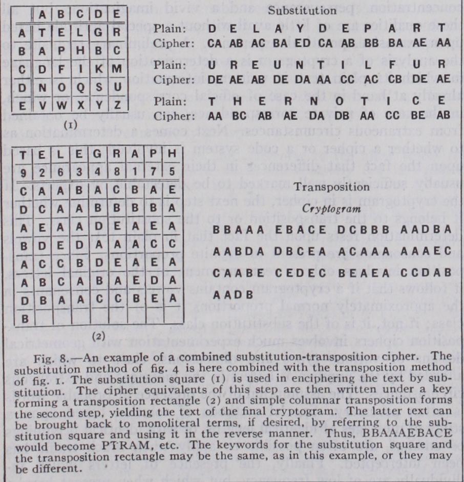 Properly selected methods of transposition and substitution when combined into a single system result in the production of cryptograms of great security, but because of the additional com plexities of operation introduced by the combination, with the resultant increased possibilities of error, such systems are not often encountered in practice. A good example, ingenious because of its simplicity and security, is that illustrated in fig. 8.