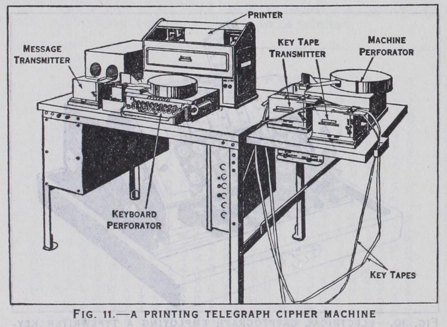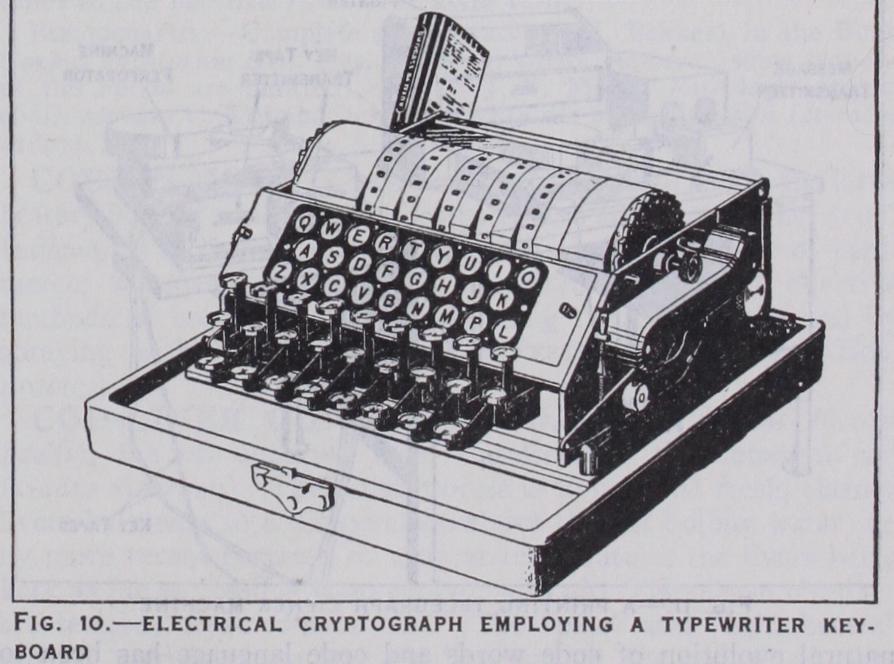 Cryptographic devices and machines for facilitating cipher operations have been known for many years; they vary in com plexity from simple, superimposed, concentrically or eccentrically rotating disks to large, mechanically or electrically operated type writing and telegraph apparatus suitably modified for crypto graphic purposes. One of the best cryptographs of the more simple, mechanical type is that known as the Bazeries cylinder, named after the Frenchman who is commonly credited with its invention in 1891. The principle upon which the device is based was, however, conceived many years before by Thomas Jefferson (see Jefferson's Papers, Vol. 232, item 41,575). The Bazeries cylinder consists of a set of 20 disks, each bearing on its periphery a different mixed alphabet. The disks, which bear identifying numbers from 1 to 20, are assembled upon a common shaft from left to right according to a numerical key. In encipherment the disks are revolved so as to bring the plain-text letters on a single horizontal line, and then the letters of any other horizontal line are taken as the cipher equivalents. The text is thus enciphered 20 letters at a time. In deciphering, the cipher letters are "set up" upon one horizontal line by revolving the disks and locking them into position. By slowly revolving the whole cylinder and examining each horizontal line, only one of the latter will be found to yield intelligible text. One of the most ingenious of the more complicated types of cipher machines is that embodied in certain printing telegraph apparatus of modern design. In this system electrical encipherment, transmission, reception and decipherment, controlled by perforated tapes, may be accomplished simultane ously at a high rate of speed. Of the many devices and machines that have been invented, constructed and marketed, only a re markably small number have ever been, or are now, in use. In general, the degree of secrecy afforded by the types heretofore constructed is not sufficiently high to warrant their adoption for diplomatic, naval or military telegraphic correspondence; and the fact that in international correspondence the cost of transmitting telegrams in cipher language (unpronounceable groups) has for over a quarter of a century been twice that for telegrams in code language (pronounceable groups) has constituted an effective de terrent to the use of cipher machinery in commercial telegraphic correspondence.
