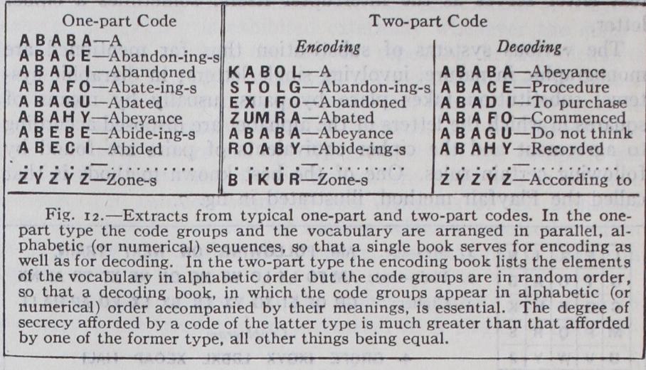 The principal purpose of code in commerce is to effect economy, secrecy being usually of secondary importance (except in banking operations) ; in governmental affairs, however, the situation is exactly reversed. A code system is secret or nonsecret, depending upon the distribution and construction of the code book, and upon whether or not it is used in conjunction with a superimposed cipher system. Codes for general business correspondence are purchasable from their publishers and therefore provide in them selves no secrecy. Many business firms, however, have private codes which, if carefully restricted in distribution, may constitute codes that may be regarded as secret except to experts. Govern mental codes are, of course, very carefully guarded in their production, distribution and usage. As to their construction, codes may be of the "one-part" or the "two-part" type, the principal difference between them being shown in fig. 12.