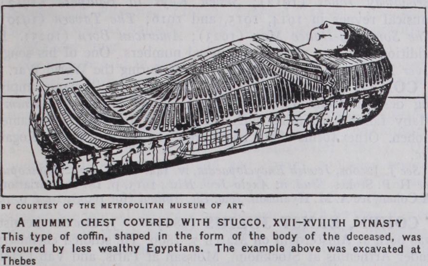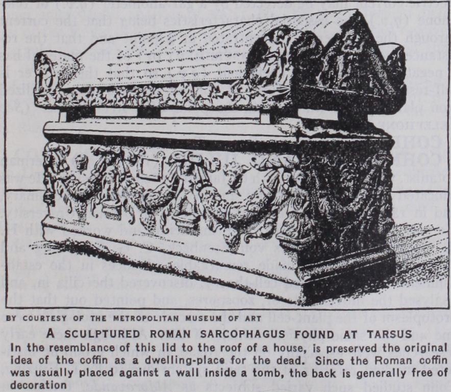 COFFIN, the receptacle in which a corpse is confined (Lat. cophinus, a coffer, chest or basket, but not "coffin" in its present sense). The Greeks and Romans disposed of their dead both by burial and by cremation. Greek coffins varied in shape, being in the form of an urn, or like the modern coffins, or triangular, the body being in a sitting posture. The material used was generally burnt clay, and in some cases this had obviously been first moulded round the body, and so baked. In the Christian era, stone coffins came into use. Examples of these have been frequently dug up in England. Those of the Romans who were rich enough had their coffins made of a limestone brought from Assos in Troas, which it was commonly believed "ate the body"; hence arose the name sarcophagus (q.v.).