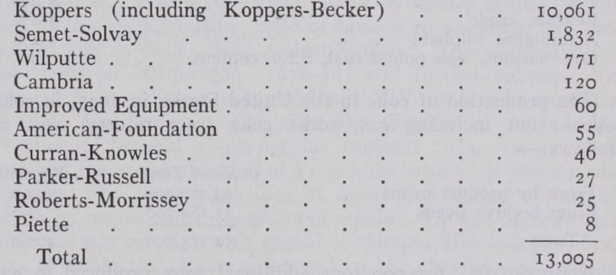 The number and kinds of coke ovens in use in Great Britain in the year 1926 were as follows:— Koppers . . • • 1,747 Collins . . . . 171 Otto-Hilgenstock . . 1,726 Huessener . . . . 262 Simon Carves . . . 1,65o Carl Still . . . . 72 Semet-Solvay . . . 1,173 Wilputte . . 74 Simplex . . . . 471 Makey Seymour . . 32 Coppee . . . 444 Other kinds . . . 6o Other kinds of Coppee . . . . 176 Beehive Ovens . . . 2,229 Tredegar . . . 120 The slow progress that was made in the direction of the replace ment of "Beehive" by "Recovery oven" coke was apparently due to a rooted prejudice against its use in blast furnaces, but that has now vanished, and fully three-quarters of the coal carbonized in Great Britain for metallurgical purposes is made in by-product recovery ovens.