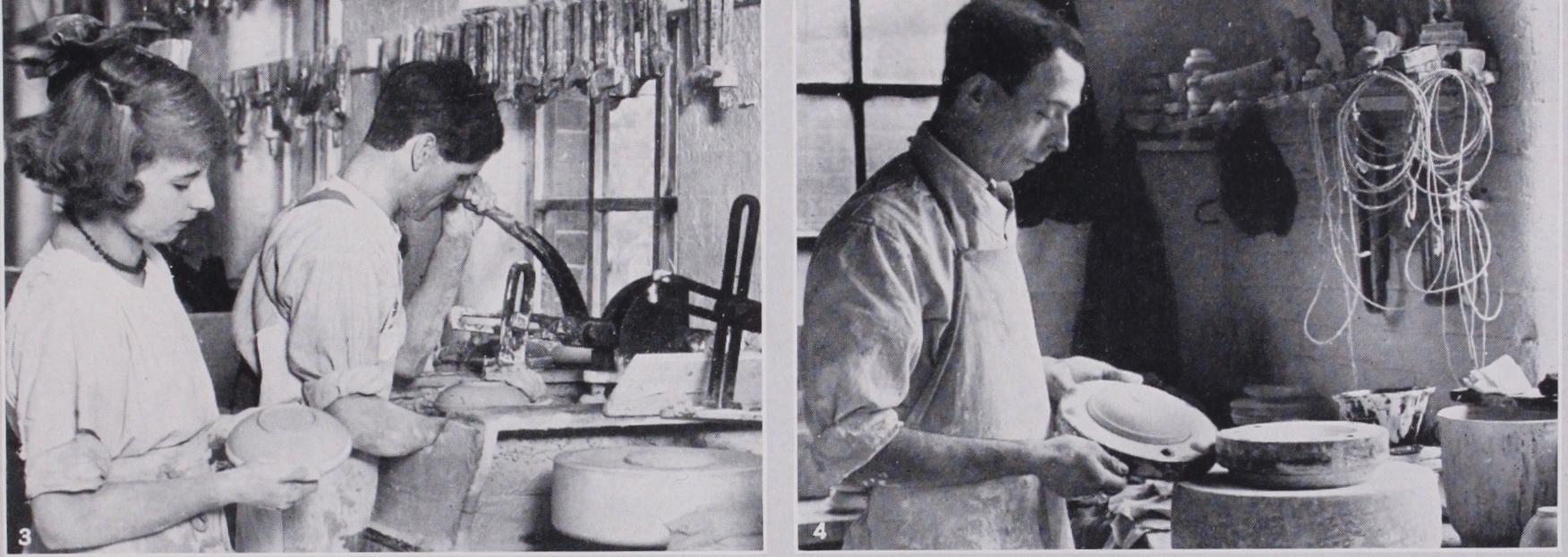MAKING THE WARE The "Slip."—The "slip," it should be explained, is the china clay and other ingredients mixed with water to a thin consistency. Metallic impurities, which would spoil the finished ware, are re moved by a series of magnets, which, in one method, are arranged in what is known as a "cascade," i.e., the watery mass flows over small falls, the metallic parts being retained by the magnets and the remainder passing on. As the "slip" has to pass over a series of small falls in cascade fashion, any pieces of metal are certain to be extracted. (Prior to this process the various ingredients have been weighed and mixed in an agitator known as a "blunger.") The "slip" is, of course, too thin in consistency for moulding into ware, and must be made into a firm and plastic condition. This is done in a filter press, an appliance used in many trades. Briefly, this consists of a number of cloth bags in square frames, which are screwed together horizontally, the whole resembling a "square" loaf, cut into slices, but retaining the shape of the loaf. By pressure, the surplus water is removed and the clay, now in flat slabs, is rolled up and passed on to the "pug mill." This piece of machinery may be likened to the domestic mincer or meat grinder. Blades, revolving in a manner popularly known as the "spiral," knead the clay and force it through a circular opening, from which it emerges as a huge "sausage." In the pottery industry, as in all other artistic crafts, mechanical means cannot effectively replace the dexterity of man or woman. The "pug mill," e.g., is an admirable method for kneading the clay, but it cannot do it so effectively as an experienced pottery worker. Such a man would cut a lump of clay into two pieces and bang one on to the other, a process which he repeats many times. Obviously this is a slower and more expensive method, and cannot be used for the cheaper types of ware.