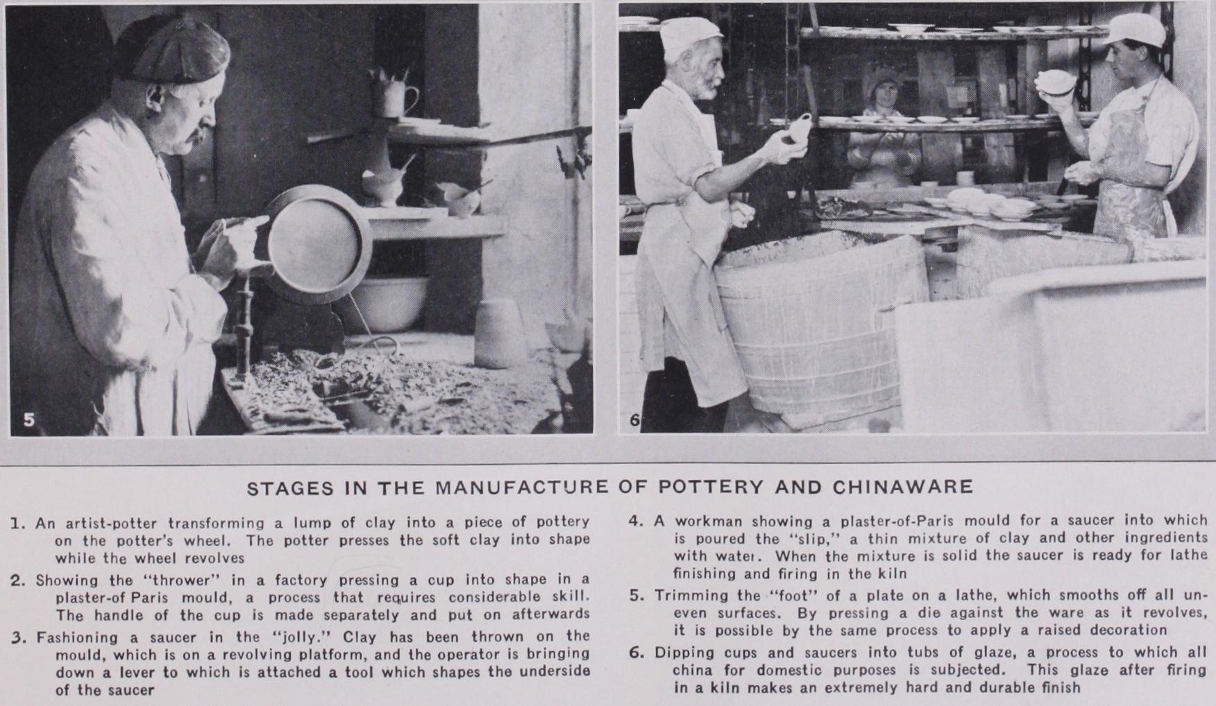 For domestic articles, such as cups, the thrower may be aided by a mould, which is made of plaster of paris. The inside of the mould will correspond to the shape of the outside of the cup. It is a simple matter—to the experienced thrower—to press the clay into the mould until the desired thickness is obtained. The plaster of paris absorbs some of the moisture in the clay, which, besides contracting, becomes correspondingly harder, and therefore much more easily handled by the potter. The cup is then passed on to a man who turns (or trims) it on a lathe. The cup, of course, is not complete without a handle, which could not be thrown on the wheel. It is therefore "cast," the clay taking the shape of a plaster of paris mould. After trimming, the handle is affixed to the cup by dipping the ends in some "slip." When joining together two pieces of clay, it is important to ensure, as far as possible, that the percentage of moisture is approximately the same in each, for if one is drier than the other, unequal contraction will take place, with the result that the two will part company. This is one of the many contingencies that the potter has to guard against, and it will readily be seen that a large amount of skill and experience is necessary for the production of good pottery.