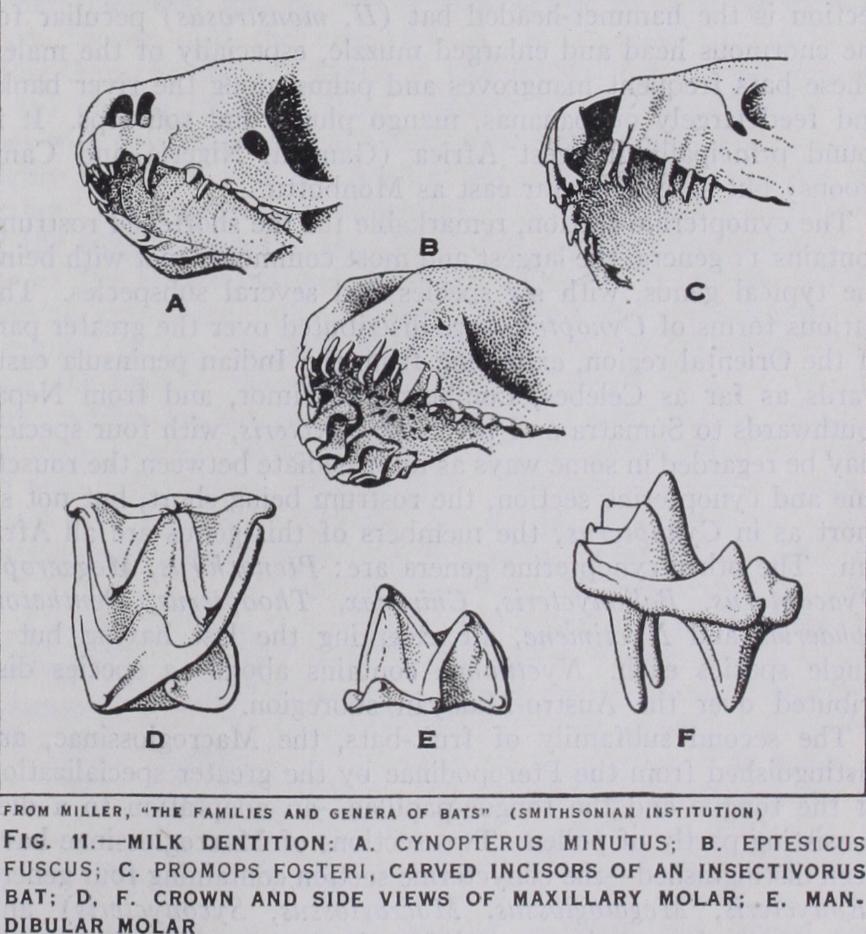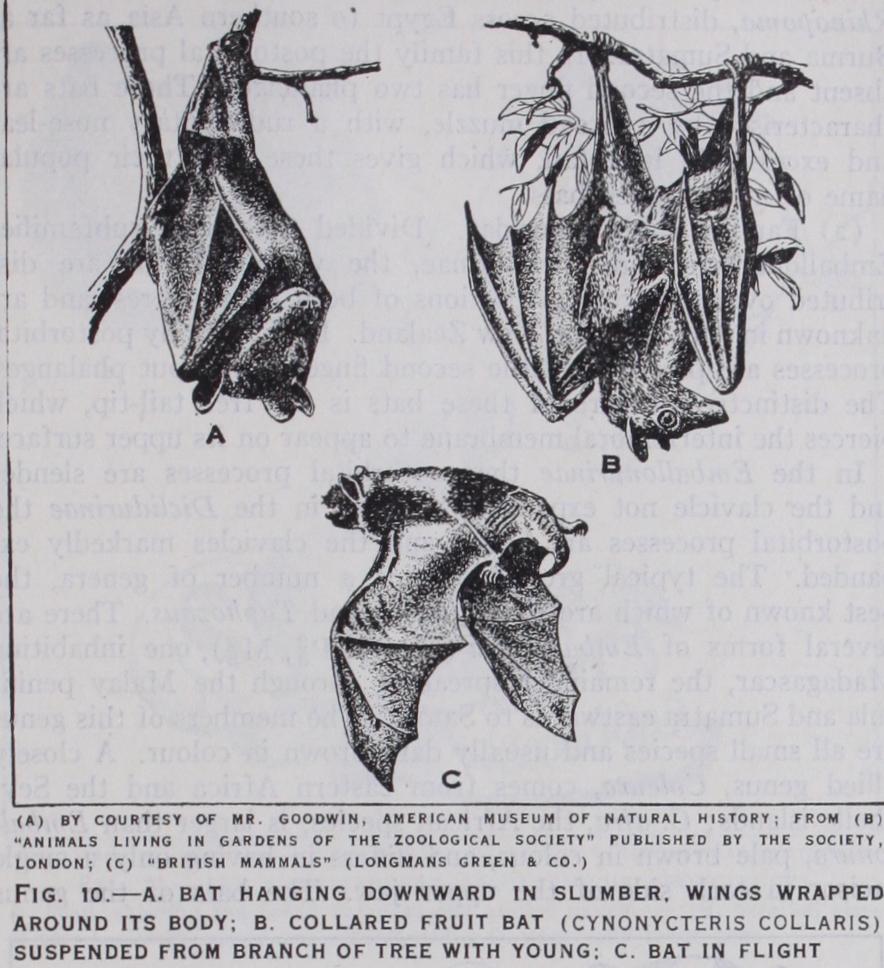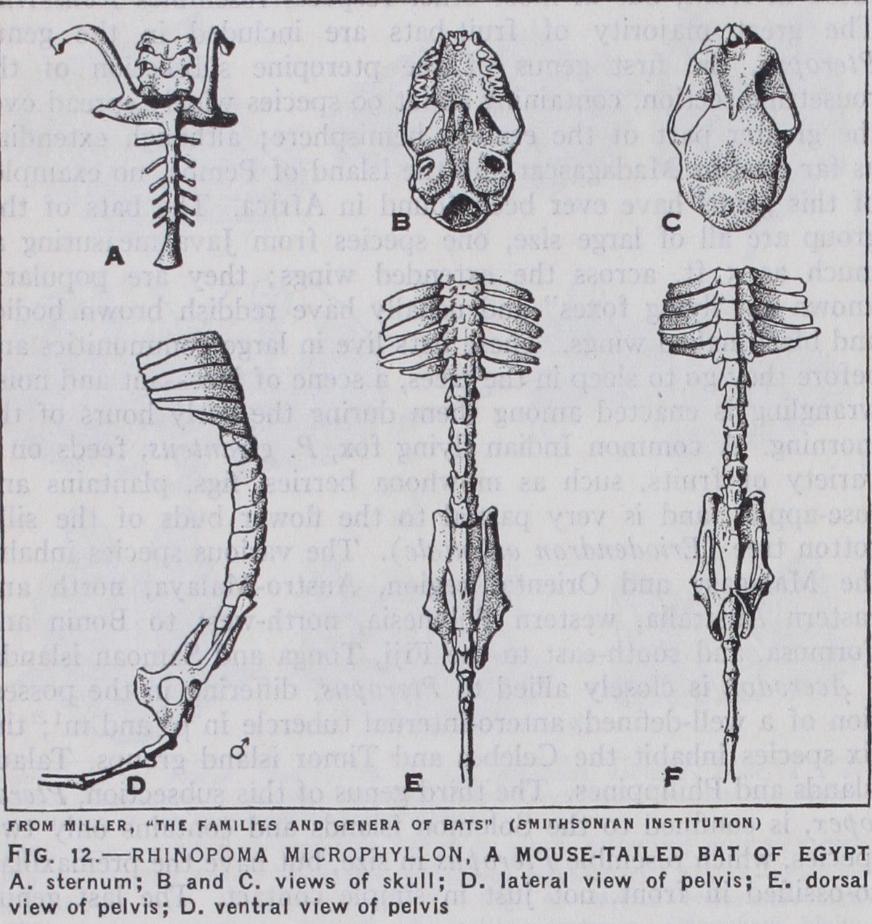 Commencing with the rousettine branch or subsection, the bats of the genus Eidolon are found only in Africa, Madagascar and southern Arabia. The African species, E. helvurn, is found over a large part of Africa, extending from the Sudan to Namaqua land; it is a highly coloured bat, the fur of the body being a mixture of straw yellow and brownish. The genus Rosettus is also found in Africa, but extends eastwards as far as the Solomon islands. The skull is much the same as that of Eidolon but there is no bony auditory meatus, and the premaxillae are joined together in front, not separate as in Eidolon. In addition to fruit, some of these bats eat many insects ; so great is the damage done to fruit crops that special measures have to be taken to protect the fruit from bats. Rousettus is divided into three sub genera, the typical one containing eight or nine species, widely distributed throughout the greater part of the distributional area of the genus ; and Stenonycteris and Lissonycteris both confined to the Ethiopian region. The two latter contain but a single species each, R. (S) lanosus from east central Africa, and R. (L) angolensis from west and central Africa. The genus Boneia also contains only a single species, B. bidens, from north Celebes; it agrees with Eidolon in having the premaxillae sepa rated in front, but in most other respects resembles Rousettus. The great majority of fruit-bats are included in the genus Pteropus, the first genus of the pteropine subsection of the rousettine section, containing about go species widely spread over the greater part of the eastern hemisphere ; although extending as far west as Madagascar and the island of Pemba, no examples of this genus have ever been found in Africa. The bats of this group are all of large size, one species from Java measuring as much as 5 ft. across the extended wings; they are popularly known as "flying foxes" and usually have reddish brown bodies and black naked wings. These bats live in large communities and before they go to sleep in the trees, a scene of incessant and noisy wrangling is enacted among them during the early hours of the morning. A common Indian flying fox, P. giganteus, feeds on a variety of fruits, such as mowhooa berries, figs, plantains and rose-apples, and is very partial to the flower buds of the silk cotton tree (Eriodendron orientale). The various species inhabit the Malagasy and Oriental region, Austro-Malaya, north and eastern Australia, western Polynesia, north-west to Bonin and Formosa, and south-east to the Fiji, Tonga and Samoan islands.