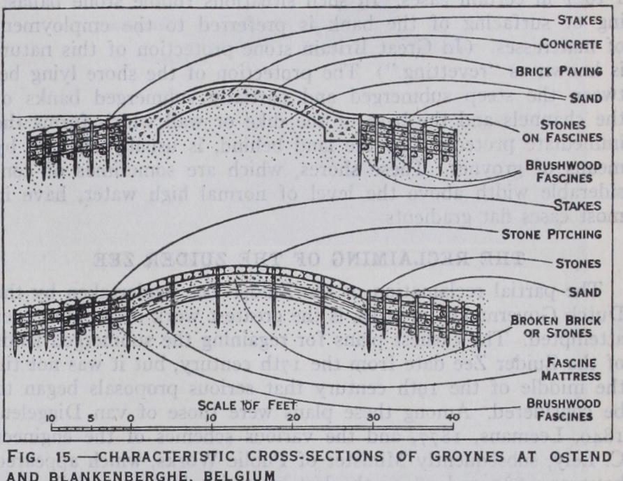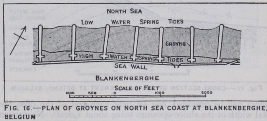 On the coast of Belgium at Blankenberghe and in its vicinity the shore is groyned on an extensive scale. The groynes on the average are about 82oft. long and 68oft. apart ; they resemble the typical Dutch groyne in form and are constructed with a foundation of mattress work or concrete, faced with brickwork or stone pitching (figs. 15 and 16) .